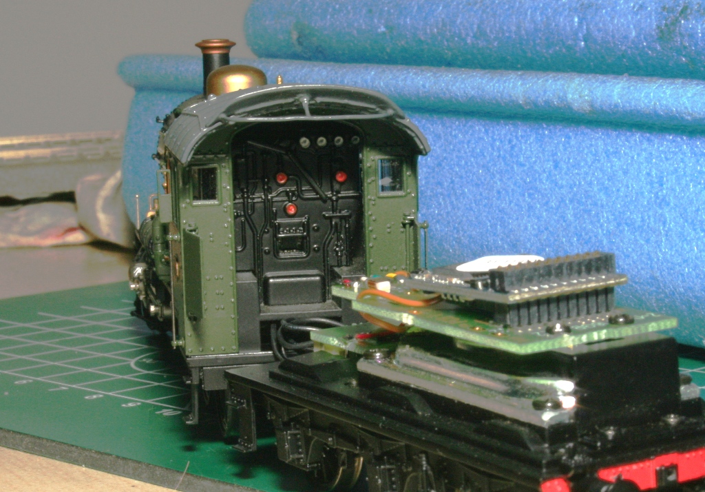 ... met de tender kap er af is een mooie inkijk in het machinistenhuis mogelijk. Het ketelfront ziet er mooi gedetailleerd uit. Ook het LEDje in de vuurkist is gemonteerd en aan te sturen met F1 van de decoder. Het mooiste effect vind ik 'Smart Firebox'.