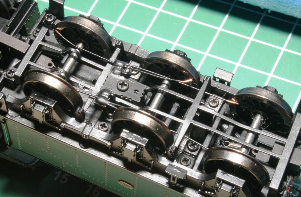 ... dan naar de techniek. Stroomafname op alle tenderwielen ! (y) Hoewel ik nog wel moet zien hoe zich dat op termijn houdt. Ik had zelf andere stroomafnemers gemaakt. Nu lopen de messingdraadjes met de 'scherpe' kant op de binnenkant van het wiel. Ik had liever een 'boogje' aan het uiteinde gehad.