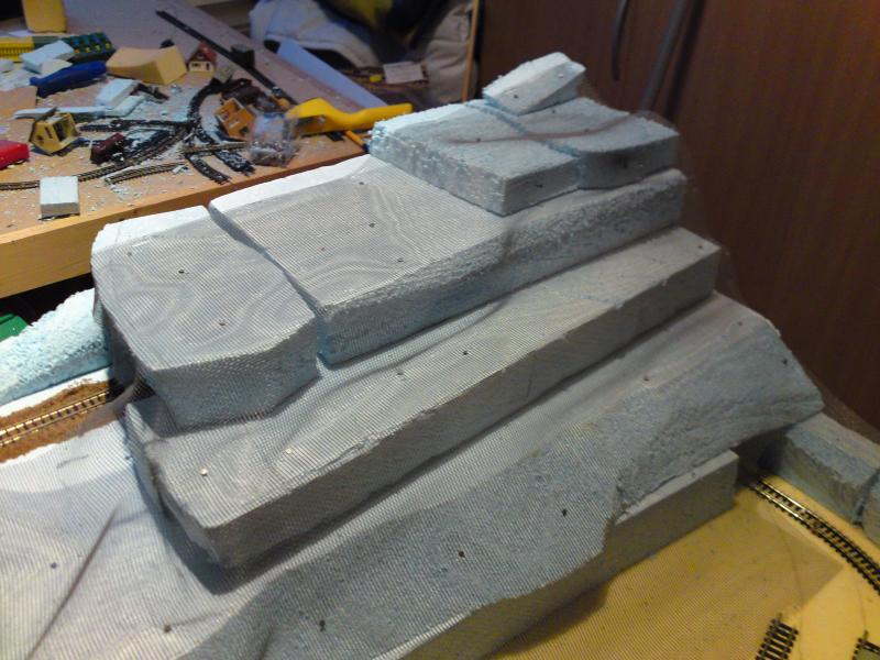 De heuvels maak ik met behulp van hardschuim en overdek dat met horregaas om het vervolgens af te smeren met flexibele vulmiddel.