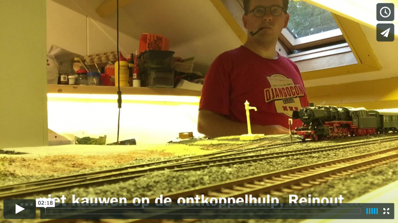 De rangeerder legt de hoorn erop. Toch handig dat hij hier even kan bellen en niet dat hele eind naar het stationsgebouw hoeft te lopen. Even verderop zit Moritz zichzelf te wassen. Even een aaitje over de kop van de kat en dan naar de wagons lopen om de lok aan te koppelen.