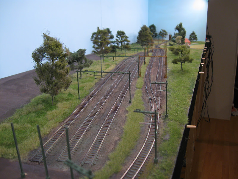 De modelbaan wordt steeds groener! De eerste bomen staan er inmiddels ook. Ik heb ook een ritje met de treinen gemaakt. Hier en daar stoppen de loks nog op de wissels maar dat komt omdat (hoop ik....) er nog geen polarisatie is.