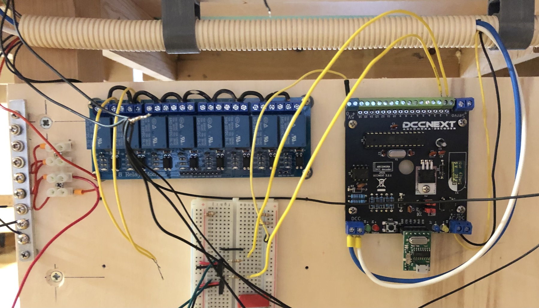 - mijn eerste opzet om de wissels aan te sturen was een meervoudige relais-module, per relais-paar schakelt deze 18V DC naar wissel (fleischmann), DCC aangestuurd. DCC aansturing van de relaismodule gaat goed echter bij het bekrachtigen van de wisselspoel; valse meldingen. Diodes anti-parallel tussen wisselspoel geplaatst echter foutieve meldingen blijven.