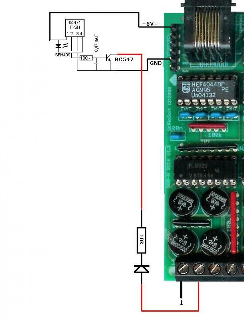 OUT gaat naar de S88SD poort, VCC en GND zijn de voeding voor de sluis maar GND moet je OOK op bruin van je centrale aansluiten anders heb je nooit een gesloten kring.