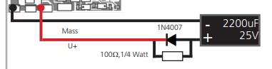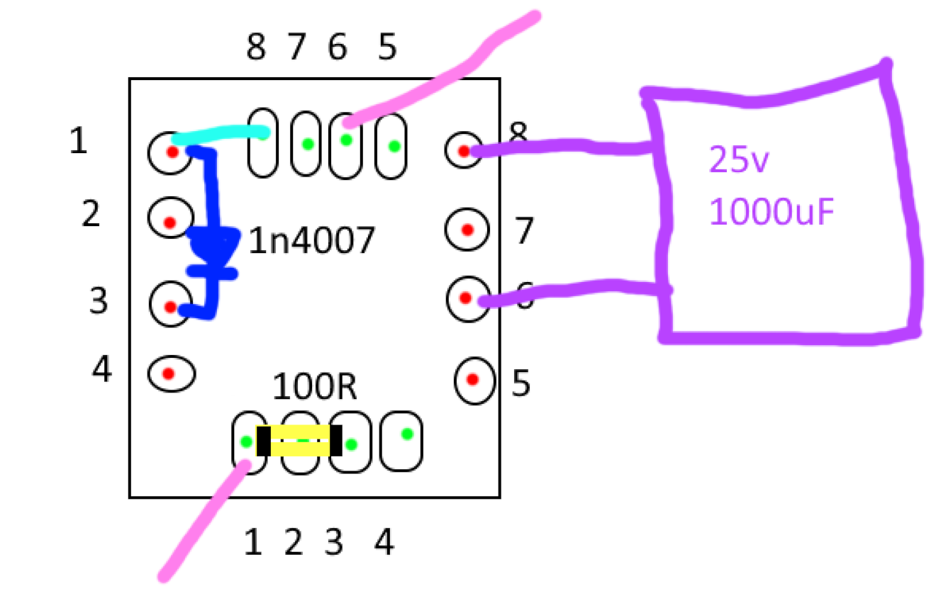 Wat betreft de vraag begrijp ik niet zo goed waarom er een print aan te pas moet komen. Je draait de draden van een weerstand en een diode in elkaar en neemt het geheel op in de draad tussen decoder en de plus van de elco. Krimpkous erom en klaar.