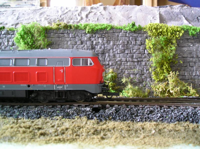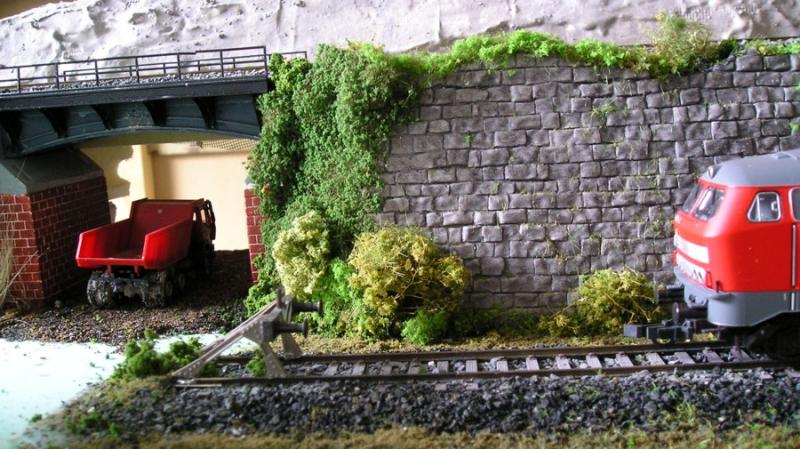 Om een voeg van een gebouw op mijn baan te calmoufleren,heb ik Heki Flor gebruikt. Dit is een soort "matje", dat je kunt knippen en uitrekken. Knip een stuk uit, doe wat lijm op de plaats waar je het wilt, en druk het zacht tegen de lijm. Laten drogen. Evt kun je het nog een beetje uitrekken en je hebt een mooie klimop.