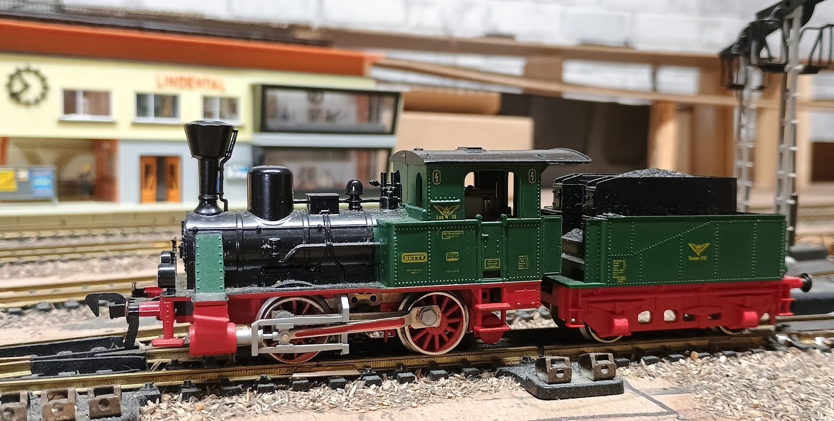 mooi compleet plaatje trouwens, de messing rails, de stroomaansluitingen , de seinpalen en station Lindental