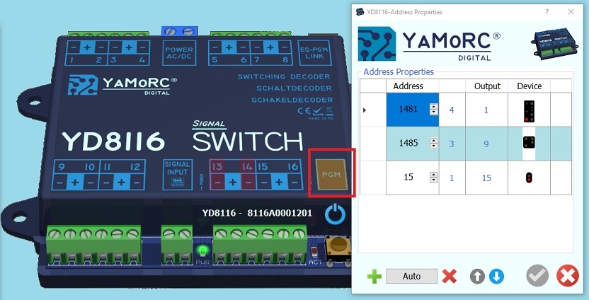 Wanneer je op de YD8116 seinen/wissels in een mix via DCCext[aspect] en via basis DCC schakeling aanstuurt dient de YD8116 ingesteld te worden op "Trigger/Mode".