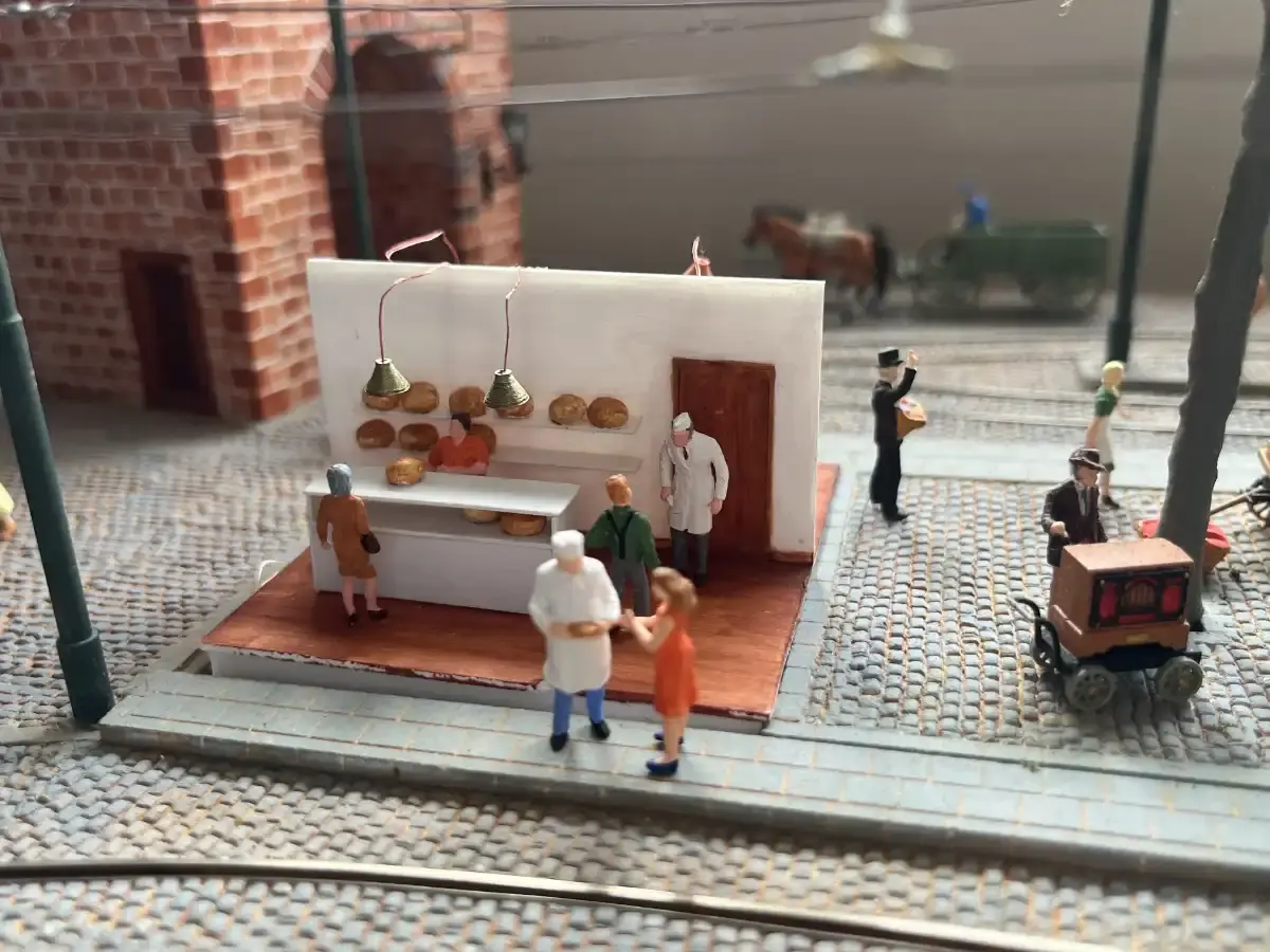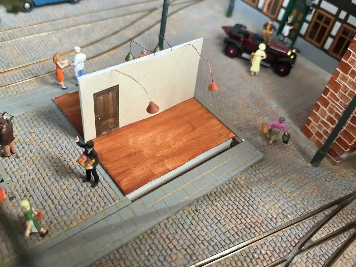 🔽 Alle draadjes zitten achter het behang, dat ik geprint heb met een deur op de juiste plek. Origineel was dit helemaal een witte wand. Ik had nog overwogen het interieur van een bakkerijwerkplaats te maken, maar het is wat lastig naar binnen kijken, dus dat is niet nodig.