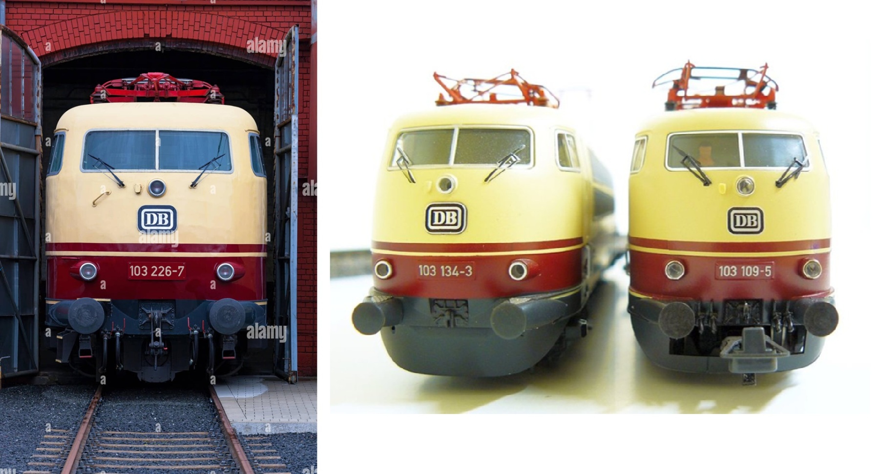 Naast 2 Piko's heb ik zelf ook nog een gepimpte Fleischmann 103 van de laatste modelserie (dus met buffers op de juiste hoogte). Die vind ik persoonlijk ook beter smoelen dan de Roco, zeker als je de ruiten met aangegoten niet kloppende ruitenwissers vervangt door goed passende ramen van de Marklin 103 (met aangegoten juiste ruitenwissers)