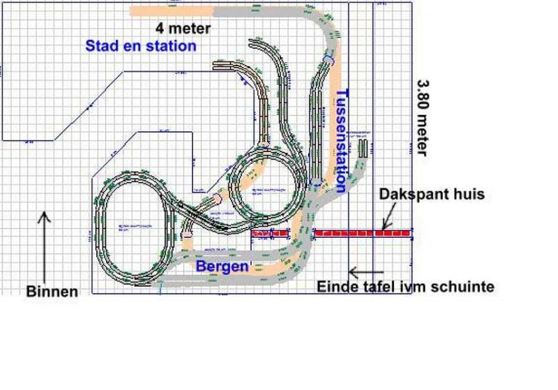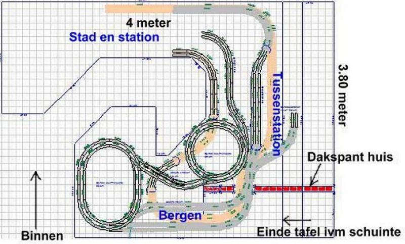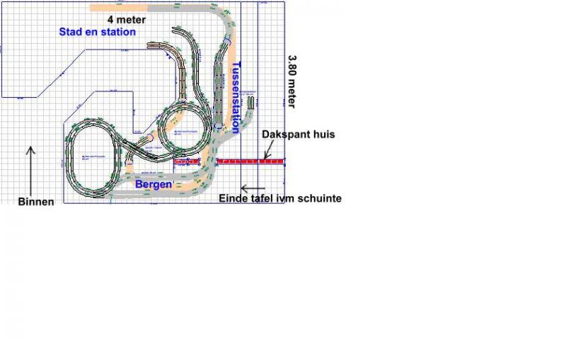 Ik zag en las je probleem. Ik denk dat je teveel wilt op een klein opervlak. Een spant veel spoor, kan je overal goed bij onder de 'tafel', want wat doe je als er iets ontspoort? Dat gebeurt altijd op plaatsen waar het net niet gewenst is. Bij klimspiralen minimaal 15cm vrije ruimte boven het spoor voor als je ooit eens iets moet opruimen wat hopeloos ontspoort is...