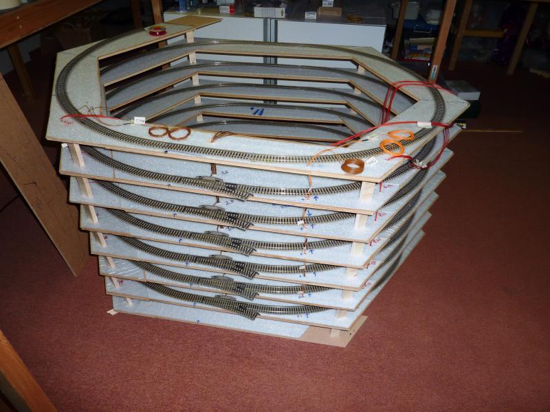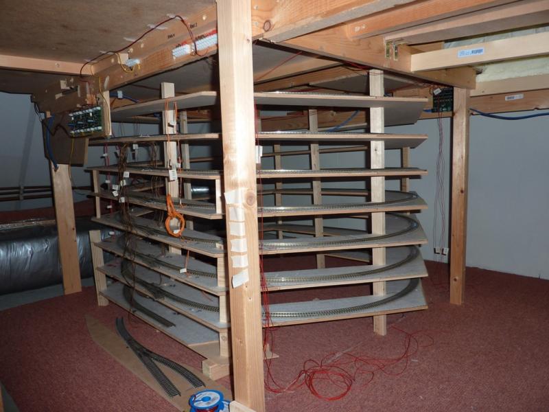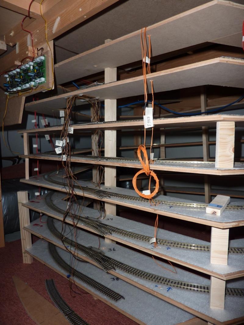 Onder mijn baan ga ik een vitrinekast bouwen. Eentje waar ik echt doorheen kan rijden. Soort schaduwstation, maar dan in het volle zicht... De vitrinekast krijgt 7 niveaus met dubbelspoor. De 14 sporen worden elk 2,5 meter lang. De vitrinekast gaat in feite deel uitmaken van de totale baan en wordt bestuurd met Koploper. Nu ben ik bezig met de eerste van de twee klimspiralen. Het is een ovaal en inmiddels zijn alle draadjes gesoldeerd en het geheel is bijna gereed om onder de baan geschoven te worden. Snel nog even fotootje gemaakt...