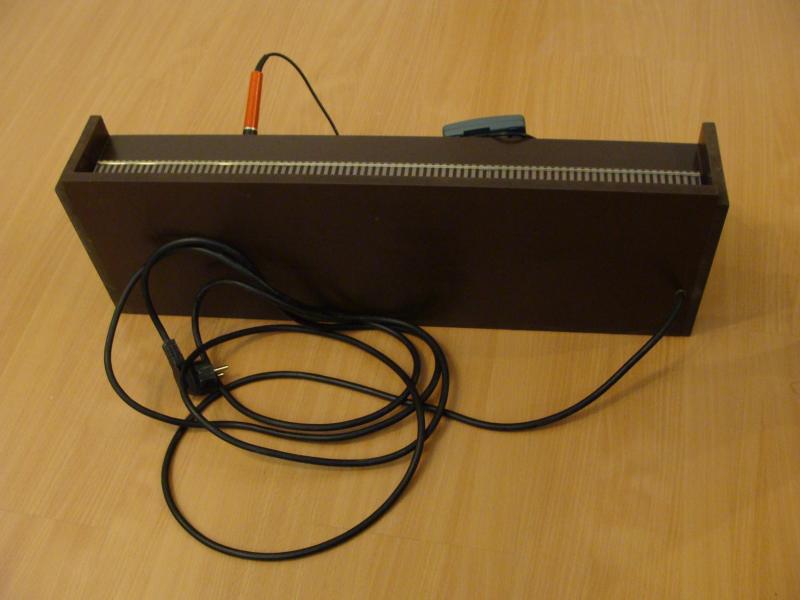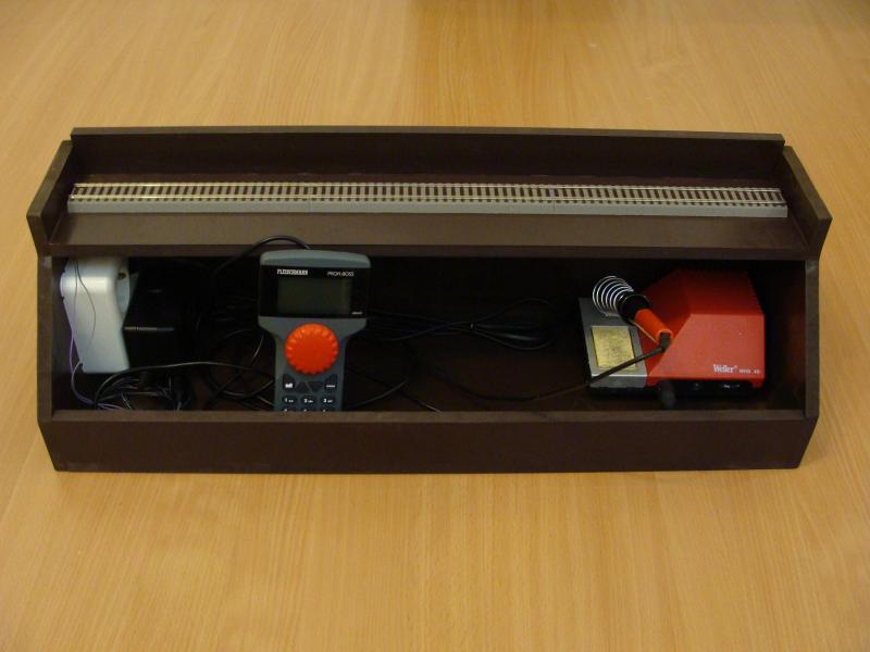 De bak is 60 cm breed en 20 cm hoog. Ik heb in de bak een 4-voudig stekkerblok geplaatst met een aansluitsnoer wat ik achter uit de bak laat komen. Meteen dat snoer ook lekker lang gemaakt zodat je daarmee niet zit te prutsen. Verder heb ik de Profiboss er in gezet samen met de Weller. Nu kan ik tenminste solderen en testen op dezelfde plek