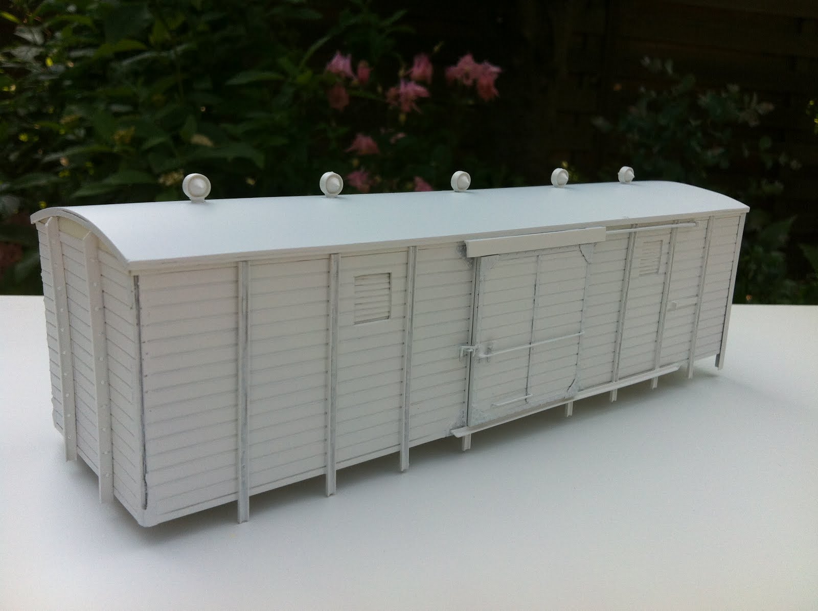 Ik moet een bruine goederenwagen wit spuiten met een Tamiya spuitbusje. Nu heb ik de ervaring dat je vrij lang de planknaden en de overgang naar de profielen blijft zien in de oorspronkelijke kleur. Om dekkend te spuiten loop je dan het risico dat de verflaag weer te dik wordt.