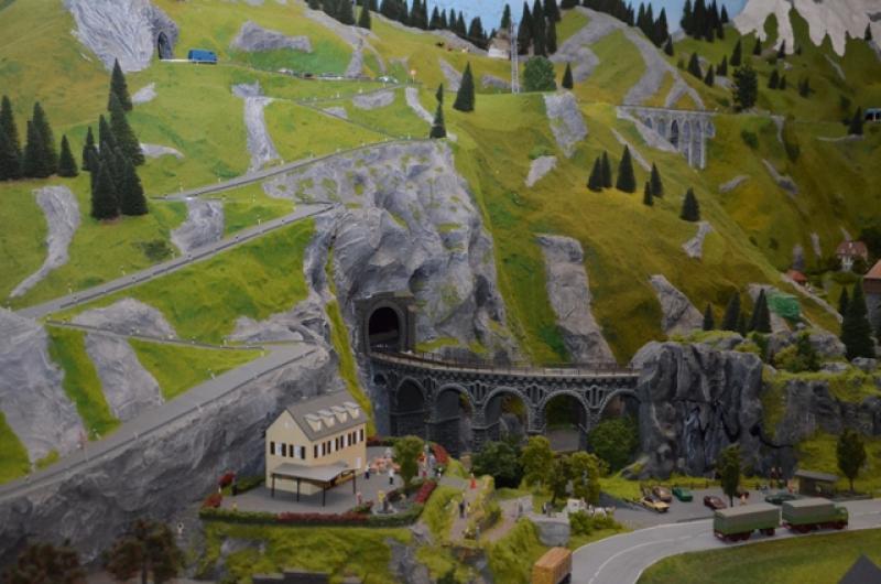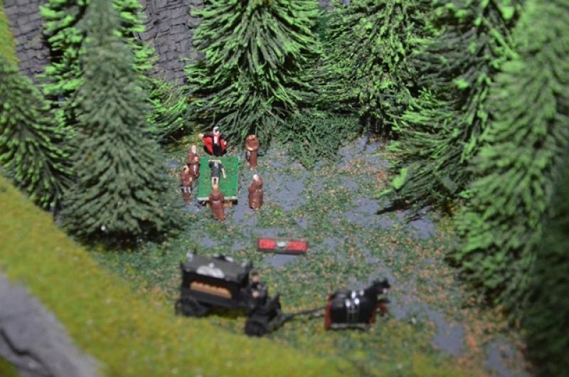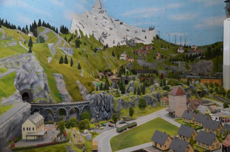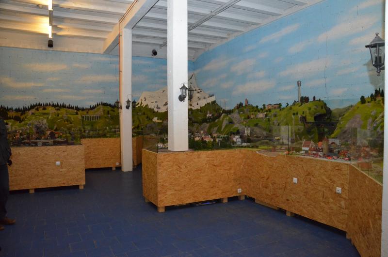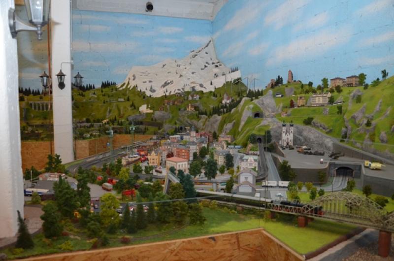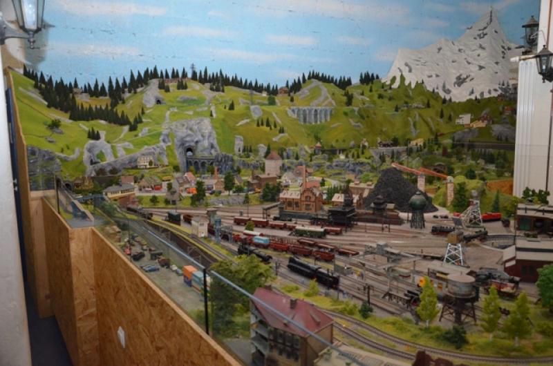 Maar er is ook een grote H0 treinbaan met een zeer merkwaardig tafereel zie foto`s.