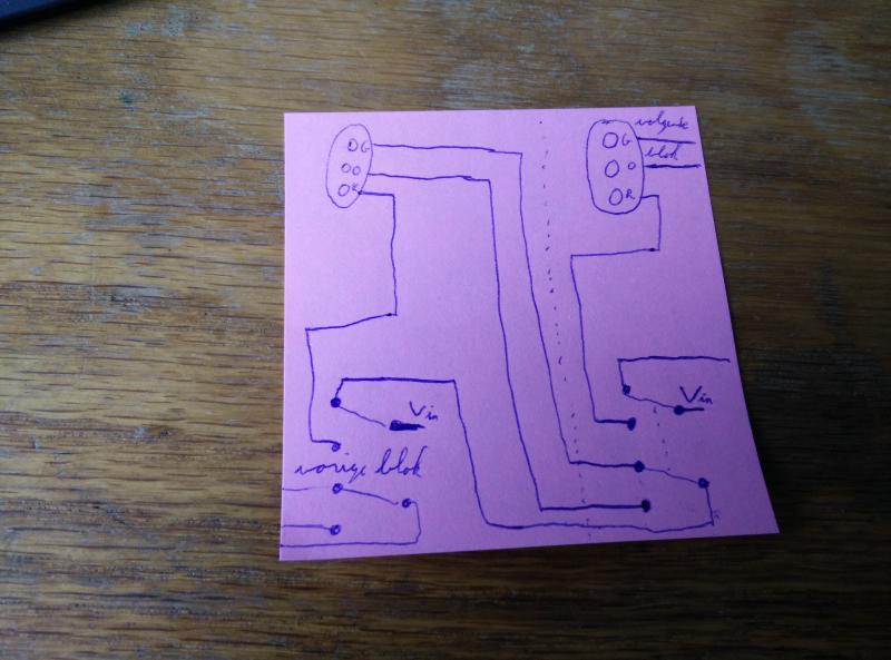 Ik heb even snel wat op papier getekend hoe je dit zou kunnen doen. (Zijn echt papier schetsjes.) Beide is geen bloksysteem als in, de trein beïnvloedt het sein niet. De stand van het sein in het volgende blok bepaalt wel of het sein groen of oranje toont. Het is steeds een deel van het geheel zodat je het kan uitbreiden naar het aantal blokken dat je zelf wilt.