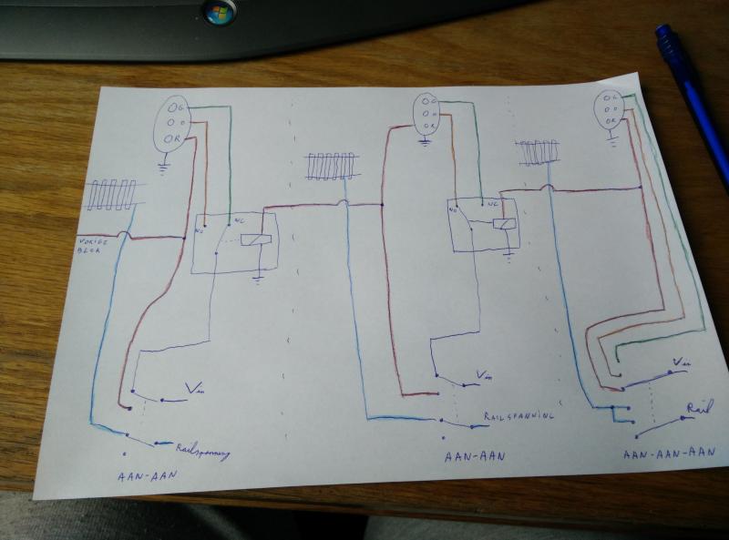 Tweede is met treinbeïnvloeding. Hier is gebruik gemaakt van een relais om het makkelijk te houden. Geheel rechts is een "eind blok" getekend waar je zelf kiest tussen rood/oranje/groen als er daarna geen eenduidig blok is. De linker twee zijn natuurlijk gewoon weer kopieën van elkaar. Eventueel is het uit te breiden om gebruik te maken van het ABC systeem voor remmen. Ook langzaam rijden zou dan kunnen als voor het relais een dubbelpolige gekozen wordt. Maarja, al je decoders moeten dit wel ondersteunen.