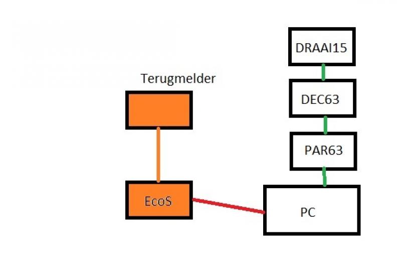 Je wissels en seinen worden verwacht ik via de decoder63 aangestuurd, net als de draai15. De Parallel63 zal net als voorheen vanuit de PC, via de parallelle poort aangestuurd. Nieuw wordt de terugmelding en de aansturing van de treinen. Dit gaat allemaal via de EcoS. De status van terugmelders kan je dus via de EcoS zien de stand van seinen en wissels niet.