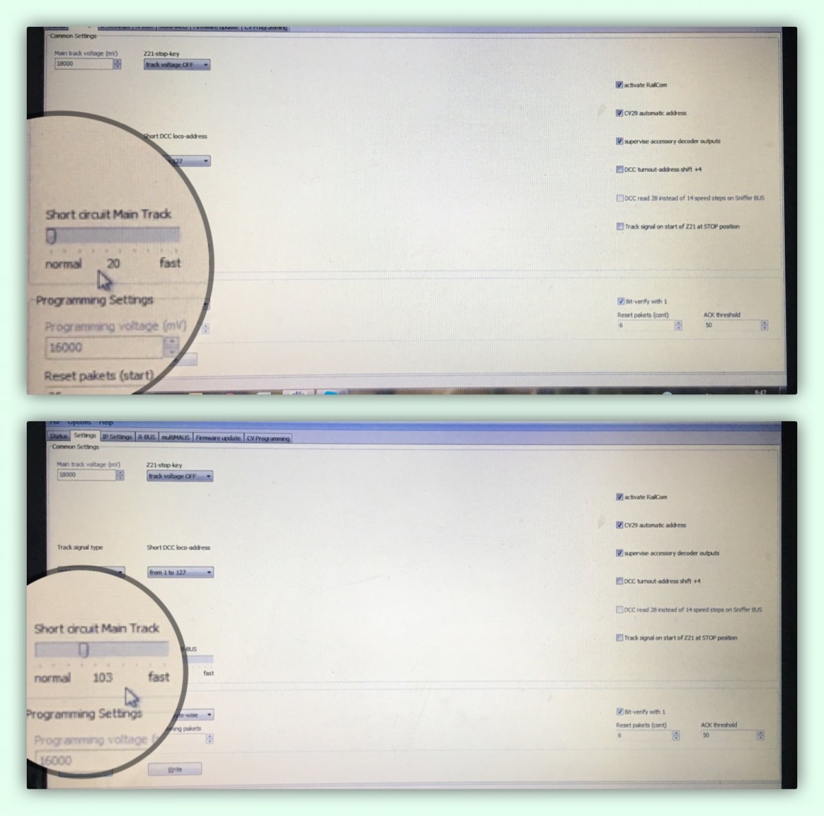 Als de Z21 ook bij de laagste stand te “snel” is, verhoog dan de “short circuit main track” instelling: