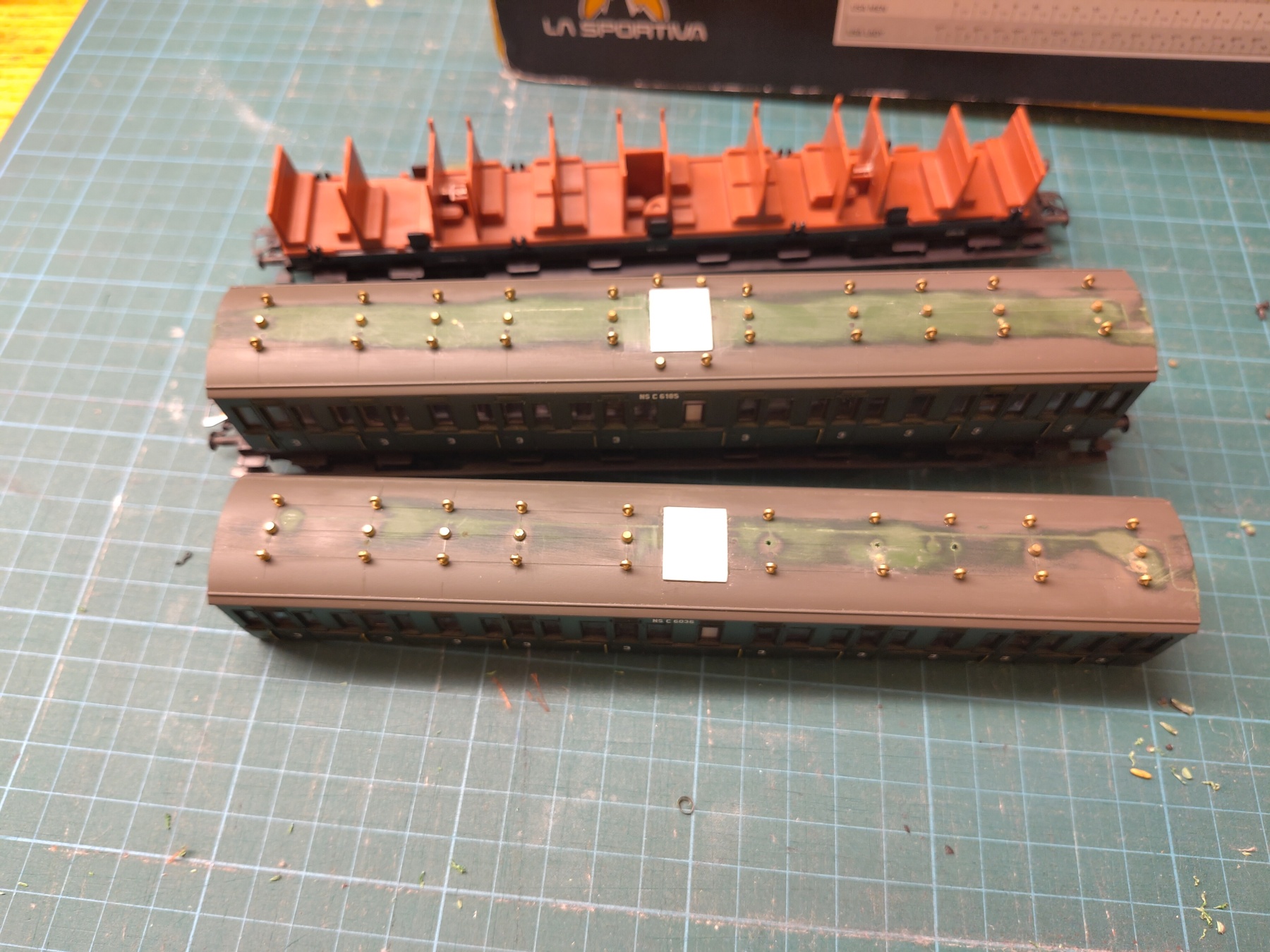Leuk hoor, goed bezig! In de basis zijn het prima rijtuigen. Misschien is het nog een leuk idee om de handgrepen te vervangen voor grepen van messing draad? Je zou ook nog een gasleiding over het dak kunnen leggen. Dit maakt het wel af.