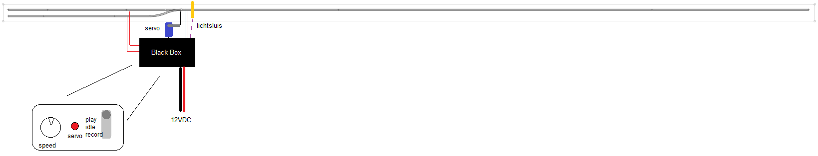 Er komt een 3 standen schakelaar, een drukschakelaar en een potmeter met een draaiknopje er op. En dat is de bediening. Met de potmeter kan ik zelf een trein laten rijden, met de drukschakelaar kan ik de servo en relais bedienen. Dus ik kan de wissel en het relais omzetten (zelf denkende wissel idee) en dan met die 3 standen schakelaar kan ik mijn handelingen opnemen. Dus alles wat ik doe met die potmeter en de drukknop dat wordt dan opgeslagen. Om er voor te zorgen dat die treinen niet van de plank af rijden, komt er vlak bij de wissel een lichtsluis te zitten. Deze wordt ook opgeslagen.