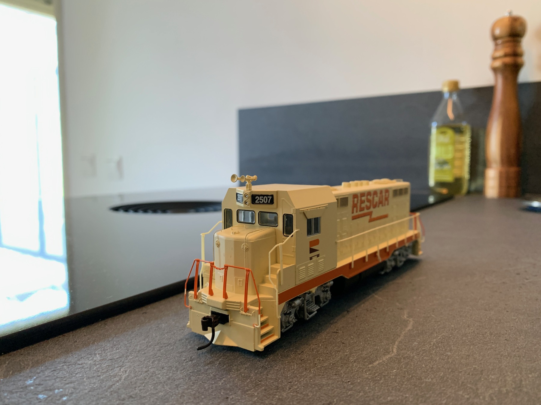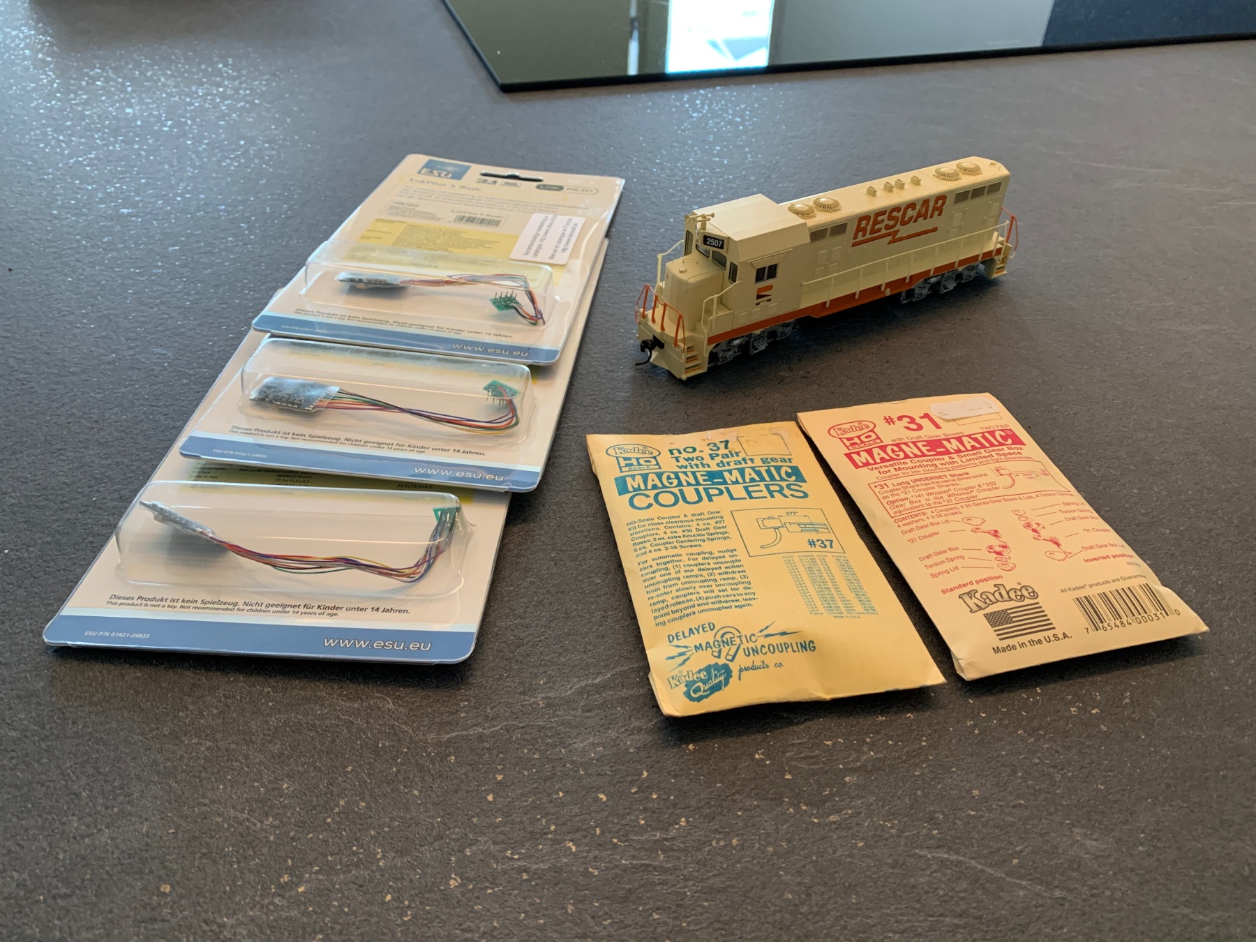 De decoders zijn voor de twee eerder al getoonde UP locs (Bachmann UP GP40 en Dash-8). De Kadees zijn voor de Dash-8. Tijdens het neuzen bij de stands stuitte ik op een Athearn CF7 voor een heel zacht prijsje in nieuwstaat met decoder. Deze loc kon ik niet laten liggen. De CF7 is zo'n typische zijlijnbewoner. Het grote voorbeeld van deze loc heeft het tot 2007 in Texas uitgehouden, daarna volgde sloop. Ik heb een zwak voor CF7's, omdat ze voortkwamen uit een andere favoriet van me, de EMD F-unit. Het profiel heeft hierdoor iets onbeholpens, want het relatief korte frame van de F3 en F7 werd gebruikt als basis voor de CF7 tijdens ombouw door Santa Fe. Juist die onbeholpenheid vind ik heel frappant. Deze moest dus mee voor er bij!