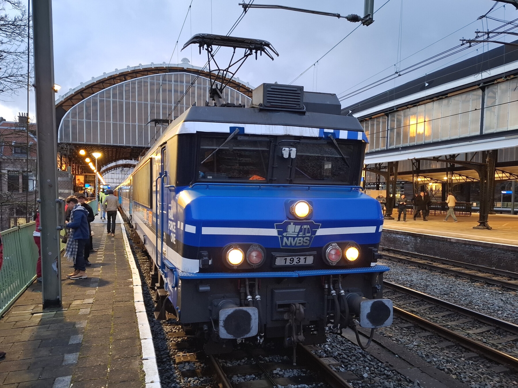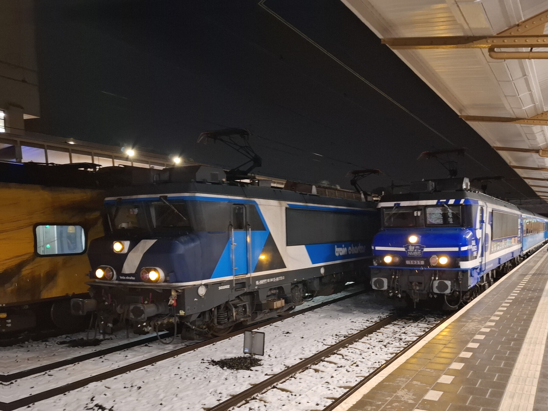 De laatste fotografen holden via de traverse naar de trein om die niet te missen . De trein was al bijna verdwenen in de sneeuwbui . Heel vaag is de andere elok nog te zien .