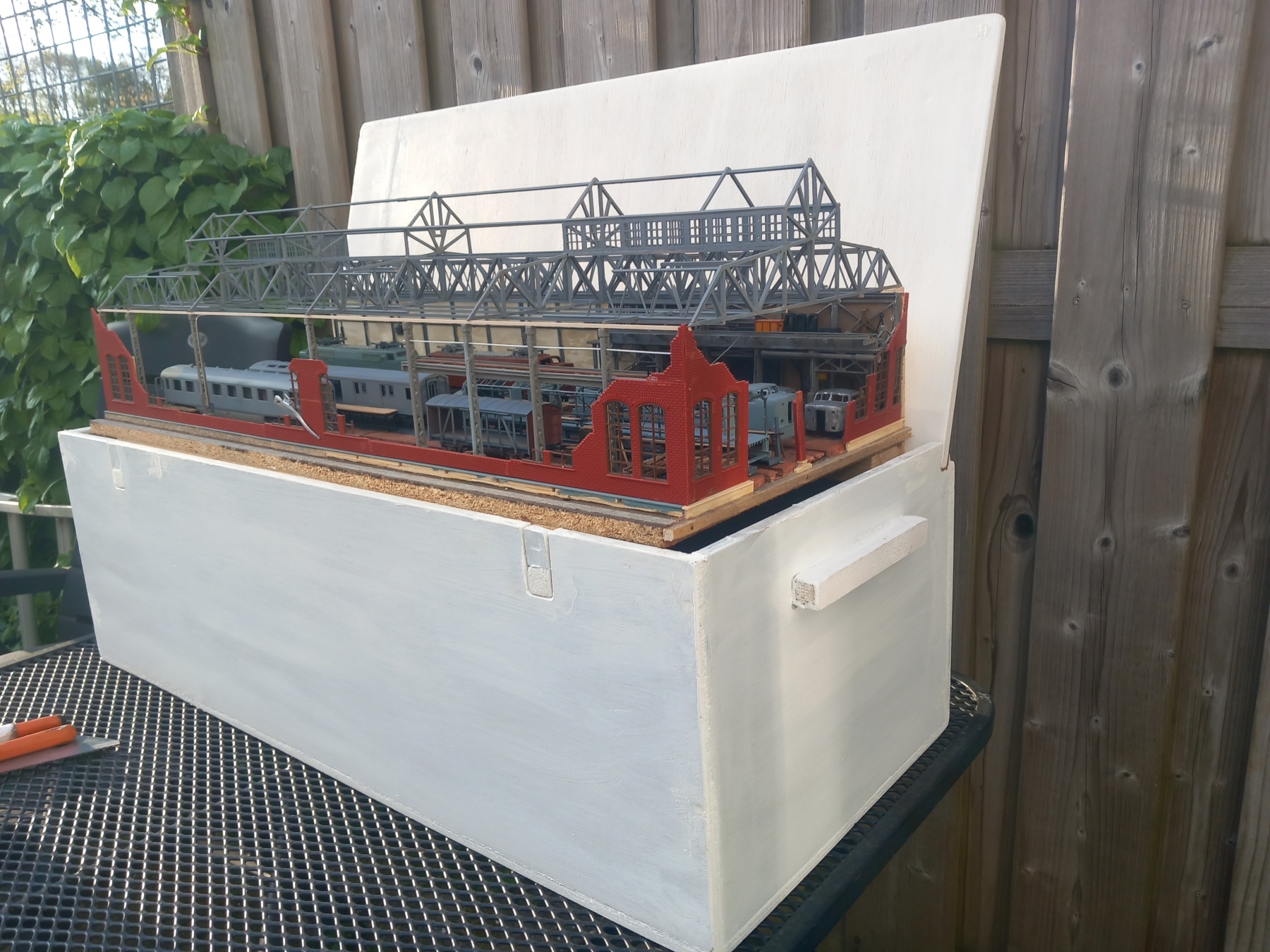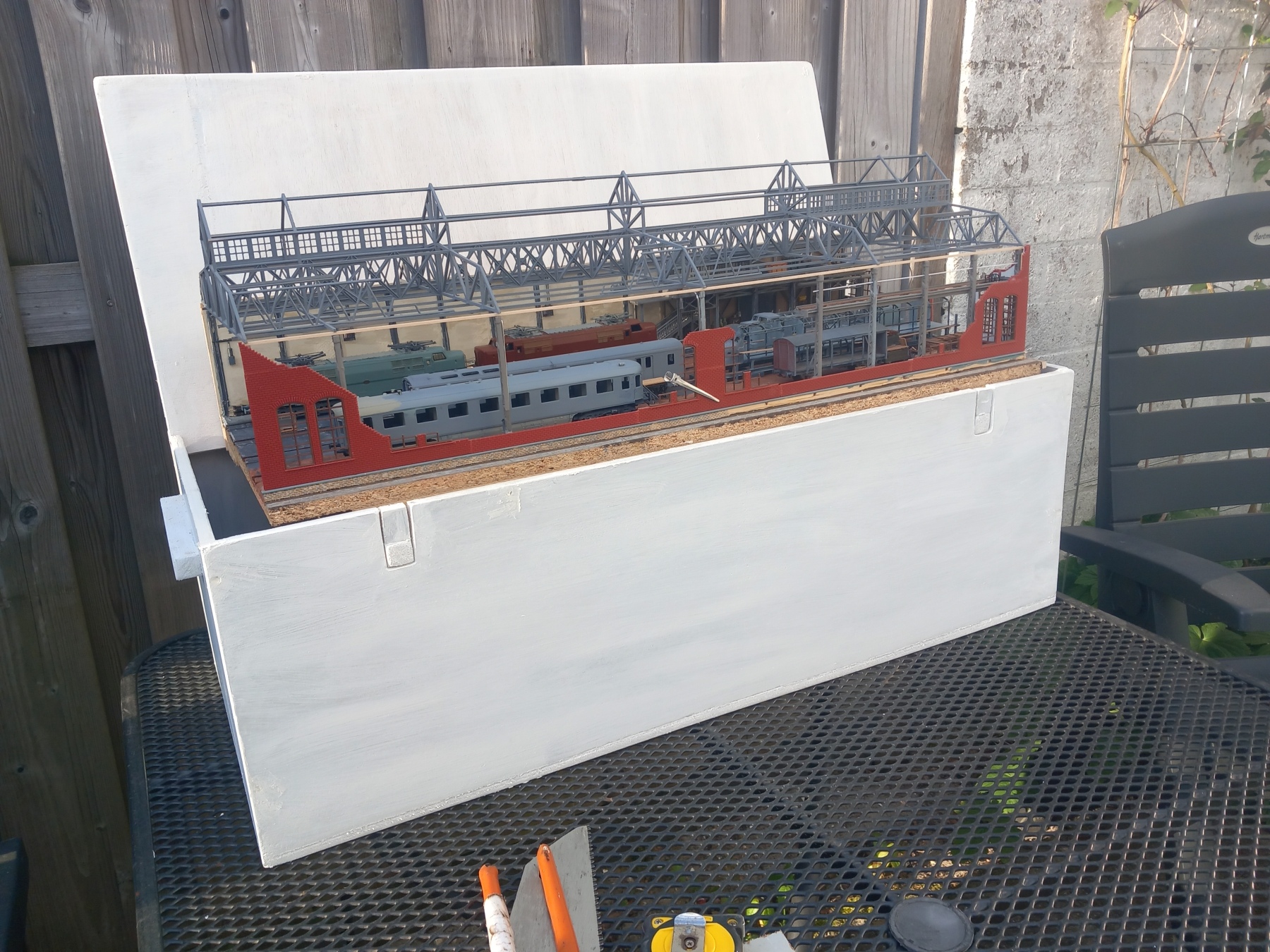 Vandaag was het heerlijk weer, ook om ff de kist voor de Werkspoorloods te verven, gisteravond de grondplaat wat meer afgewerkt en nu meteen hetzelfde zwart geverfd als de kist, ik ben er blij mee:
