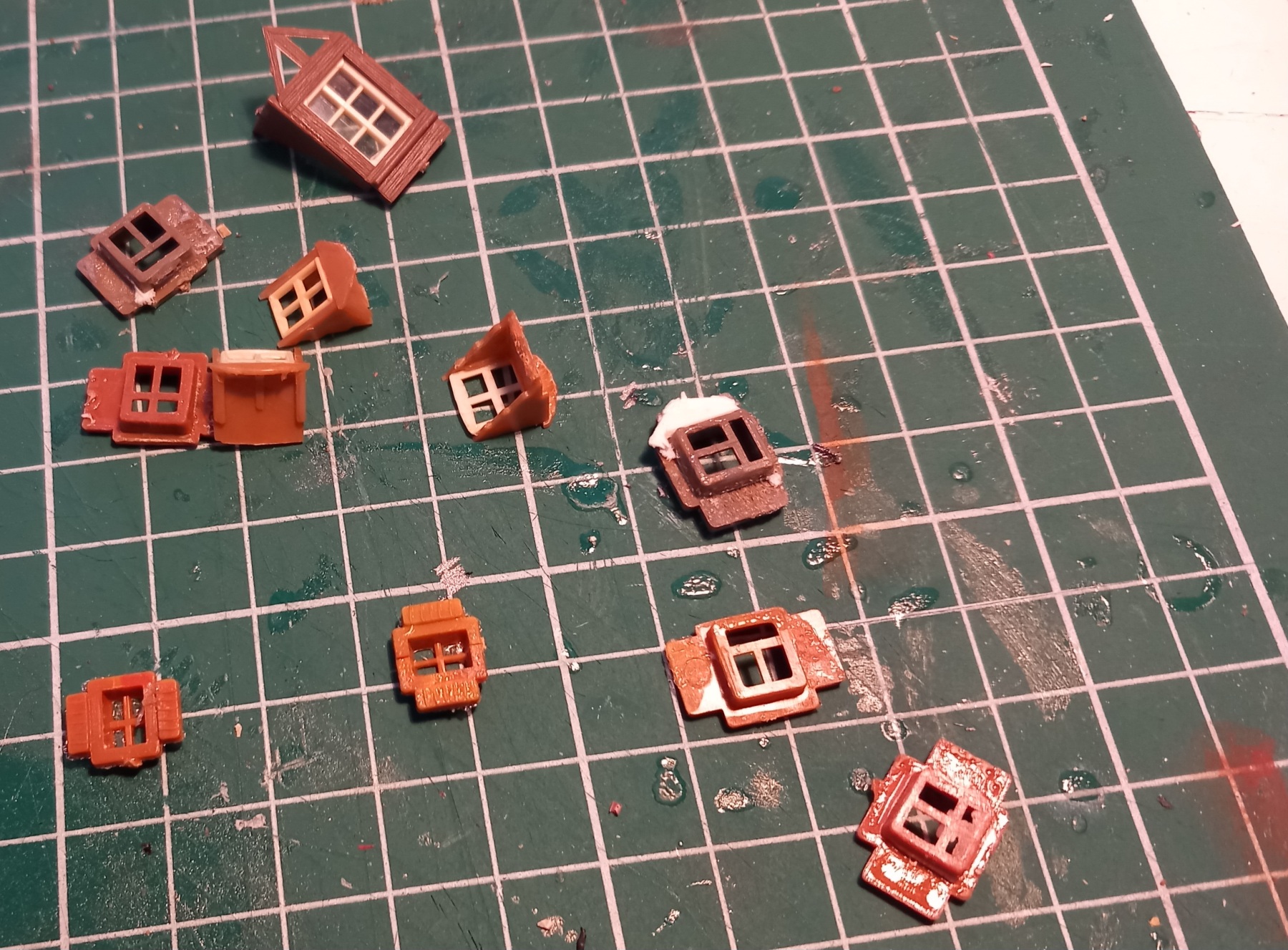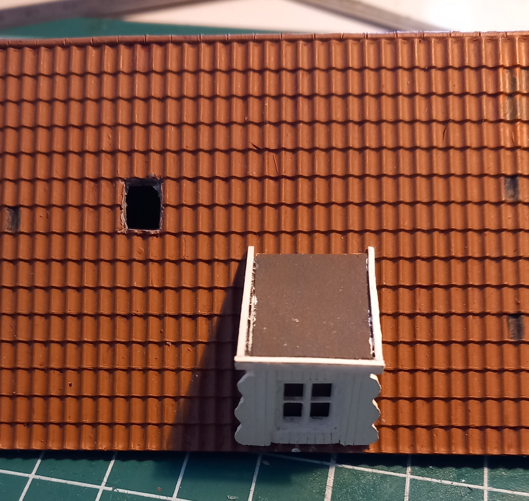 Meteen ook nog ff de beloofde foto van de grijs geschilderde daken, nog niet klaar maar een stuk beter als grijs plastic en rood schuurpapier: