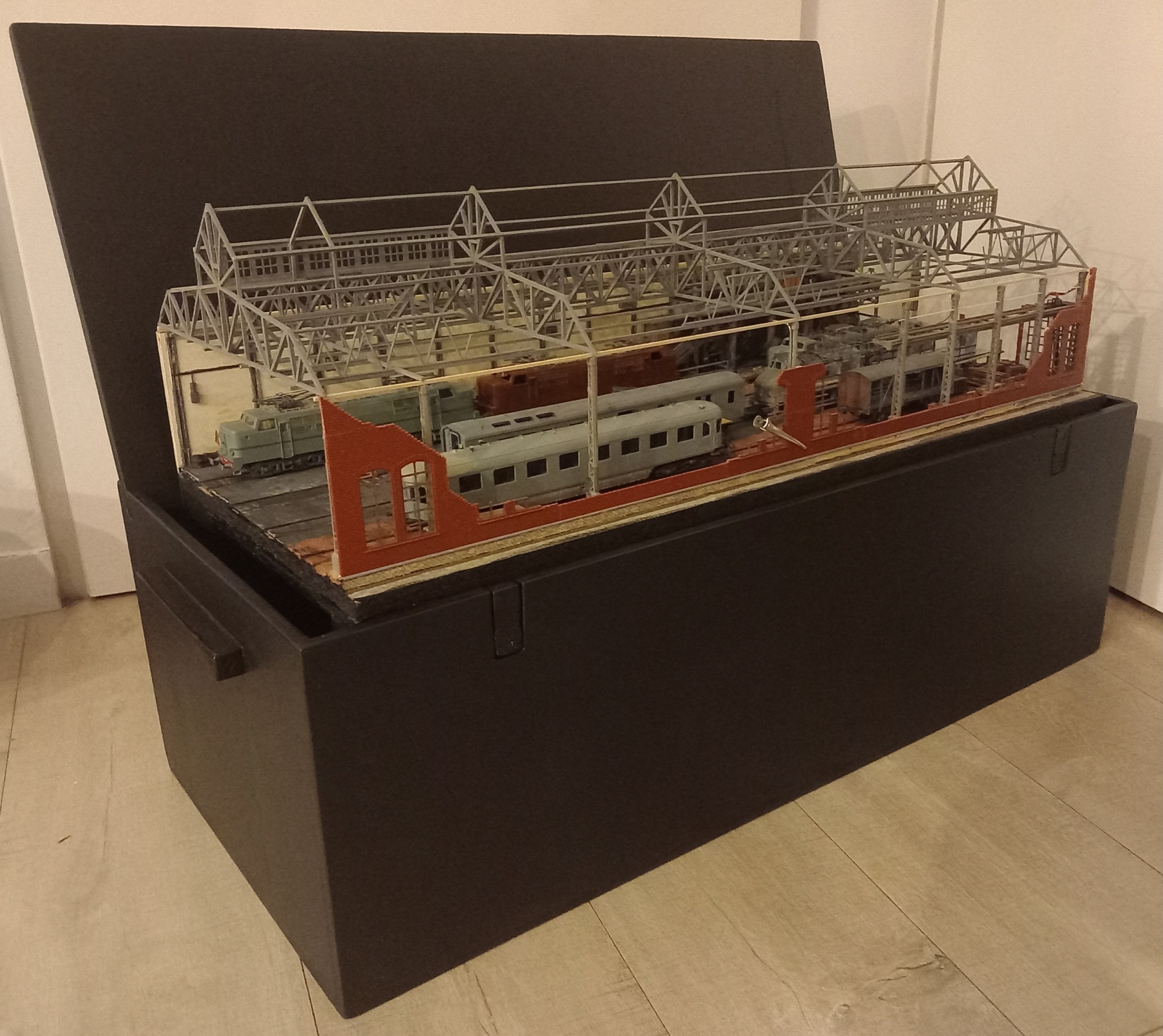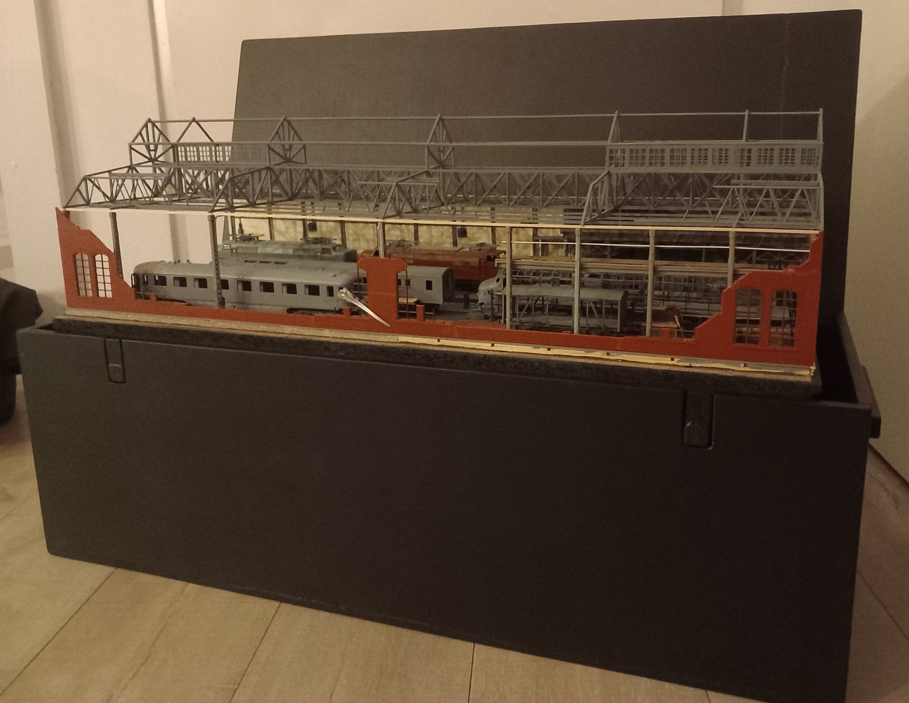 De aluminium kisten van de scheepswerf die ik van de week beschreef, zijn inmiddels opgehaald door de eigenaar waar ik ze van in bruikleen had, dus die ben ik helaas kwijt. Dat geeft wel miss weer de kans om een soortgelijke kist als die voor de Werkspoorloods te maken voor de beide scheepswerfdelen. Gaan het zien.