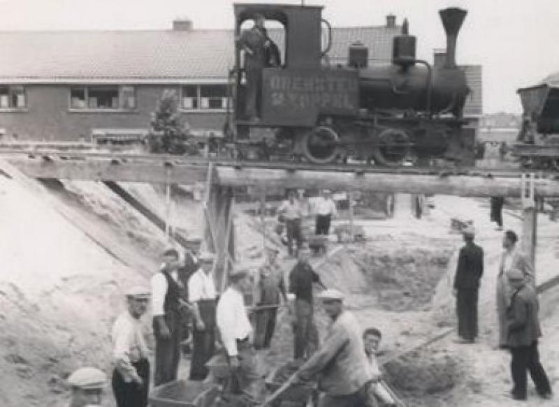 Na het bombardement van Rotterdam moesten de uitgebombardeerde Rotterdammers nieuwe woonruimte hebben. Hiertoe werdt o.a. in de Vlaardingse Babberspolder grond rijp gemaakt voor bebouwing. Het moest snel gebeuren en mocht weinig kosten. Gekozen is voor barakken bouw zonder heien. Om toch een stevige ondergrond te krijgen moesten tonnen zand aangevoerd worden. Hiertoe werdt een smalspoorbaan aangelegd van de Oosthavenkade, Hoflaan, Buizengat, naar de bouwplaats. De foto is genomen op de plaats waar de zeedijk gekruist moest worden. De huizen op de achtergrond staan aan de Irisstraat. Drie bokken naar links, daar waar de irrisstraat overgaat in Dijkzich, zit MTE aan de voorstraat.
