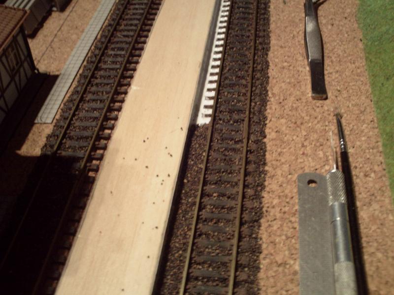 Tenslotte moet je bij de wissels opletten dat de wisselaandrijving vrij blijft van balastTer plaatse van de wissels word de ondergrond geschilderd in de kleur van de balast
