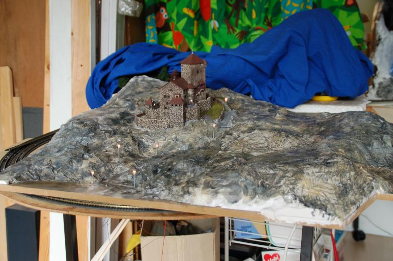 . De laatste weken weer wat meer tijd over en ben begonnen met de afwerking rond mijn burcht. Na een aantal uren hak en breekwerk in het gips heb ik de rotsen een kleurtje kunnen geven: