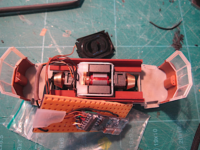 Het plaatje wat in het dak komt te zitten, met aan een kant de decoder (en de later verwijderde Tran/CT Elektronik speaker), de andere kant verlichting en aansluitingen voor de motor.