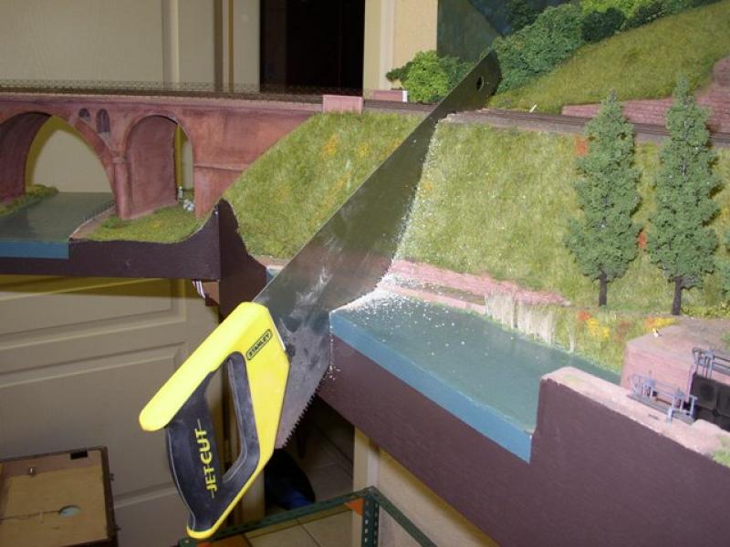 De opritten en platen heb ik ook met de decoupeerzaag uitgezaagd. Poten en frames (grenenhout) van de baan heb ik op maat gezaagd met een afkortzaag, die ik ooit een keer in de aanbieding (80 EUR) bij de Lidl heb gekocht. Aparaat heeft een vermogen van zo'n 1400 Watt en komt overal doorheen