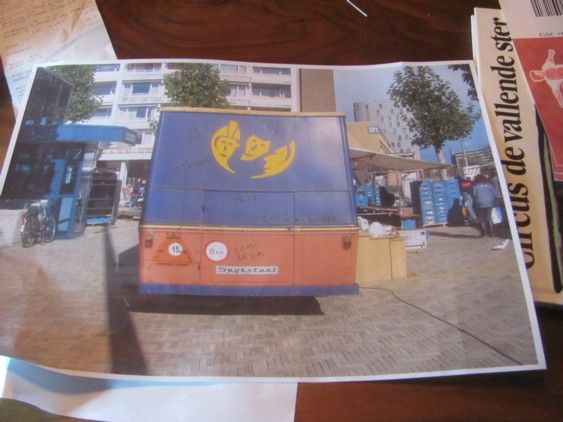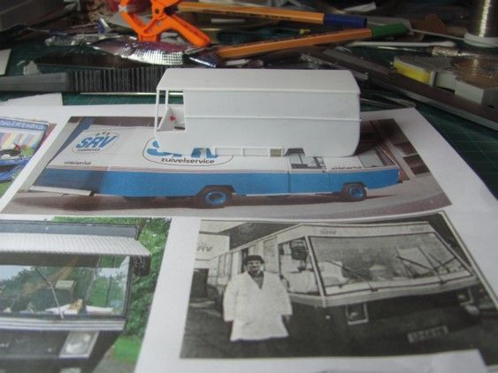 heb ik bedacht om dat maar eens te proberen. Tot 30 jaar geleden werkte ik op zaterdag bij een SRV-man. Die had niet zo'n grote wagen trouwens. Het is wel dat model dat ik graag een keer wil hebben in 1/87. Maar ik heb geen ervaring in bouwen met styreen dus heb ik eerst maar een eenvoudiger model gezocht. Het voorbeeld kwam ik laatst tegen in Diemen, een 7 meter lange oude SRV-wagen is in gebruik als wereldwinkel