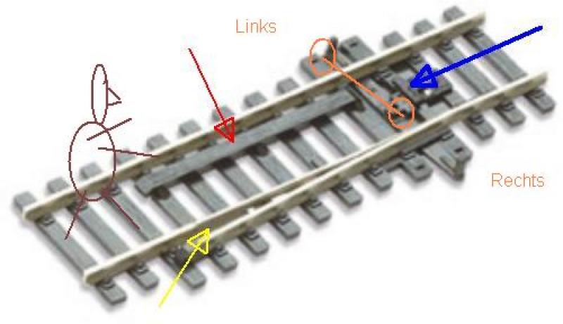 Als de tong naar binnen wijst (ontspoorstand) dan zal de wagon eerst nog iets rechtdoor rijden.