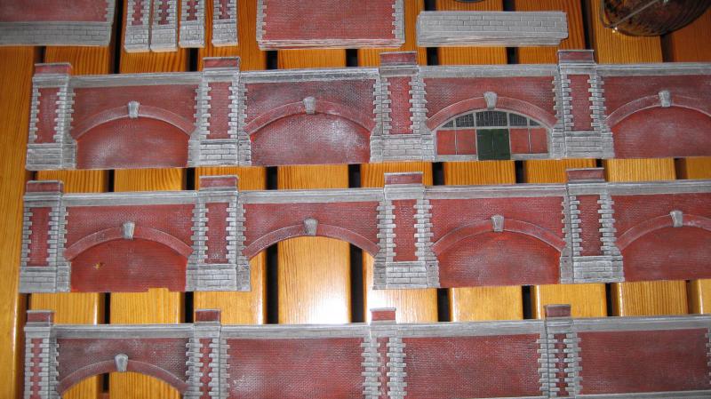 Zelfs gebogen muren is mogelijk. Was een tip van Spörle. Als de gips in de mal is gegoten wacht je tot het stevig begint te worden. Je legt nu afhankelijk van of de muur bol of hol moet worden aan beide zijden, of in het midden een latje onder de mal. De dikte van het latje moet je vooraf bepalen. De mal is zo soepel dat deze makkelijk meevormd.