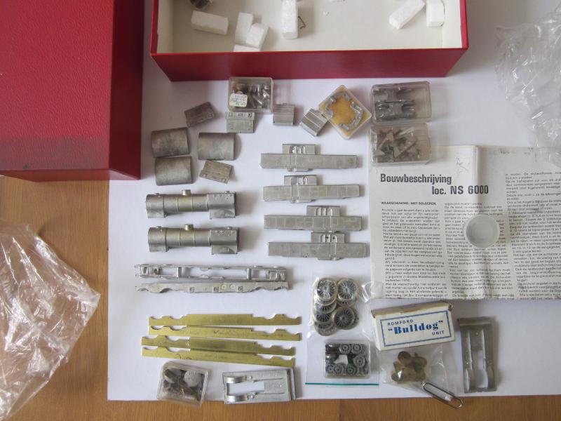 Hieronder een foto van de kit zoals ik die op MP kocht. Heel veel zit er dubbel in, zodat ik er twee exemplaren van kan bouwen. Onder zijn de messing frameplaten te zien die de erboven gelegen witmetalen frames moeten vervangen. Ik wil een poging doen twee assen verend in het frame te plaatsen. Ik begrijp dat ik dan het beste de middelste as voor de aandrijving kan nemen. Bijgevoegd bij de bouwdoos zijn allerlei detailtekeningen van de NVM. De kit schijnt in het jaar 1970 geproduceerd te zijn. Kent iemand de producent / de kit?