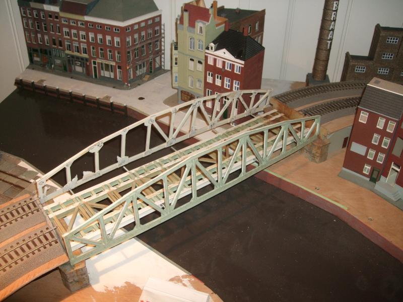 Ja, dit is zelfbouw, en volledig eigen ontwerp. Zelfgesneden styreen strip, samengesteld tot U-profieltjes, etc. De brug is 460 mm lang (= 2x een lengte RocoLine). In het brugdek zitten 4 stalen strips 1x5 mm verwerkt, rechtop staand. Dat maakt hem erg stevig.