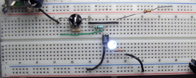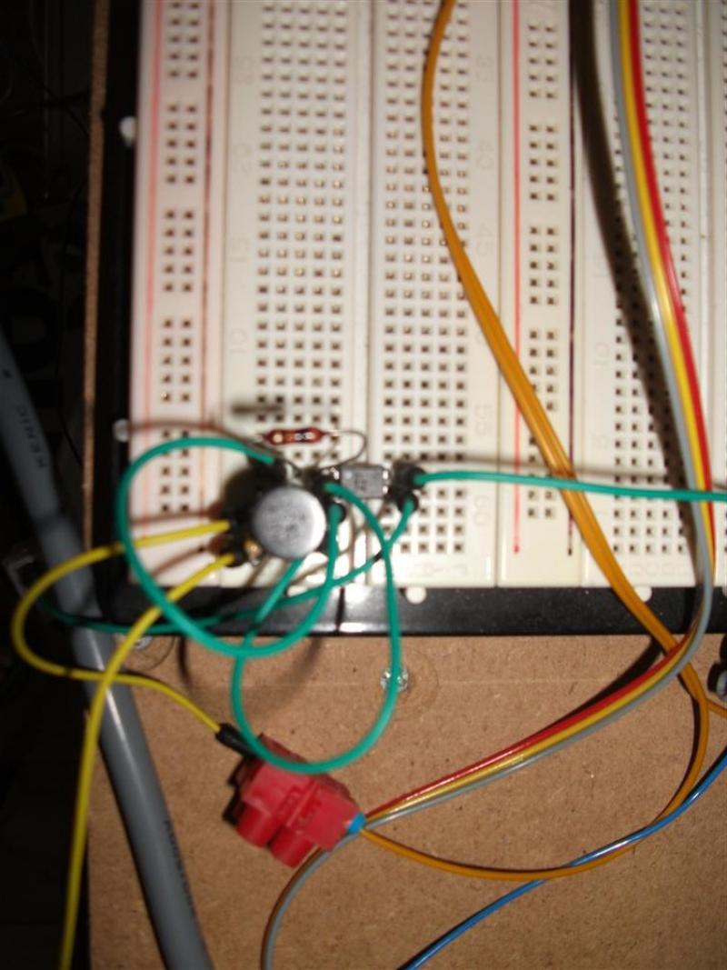 Heb de schakeling even op mijn breadboardje opgebouwd. Linksboven is de digitale spanning aangesloten.