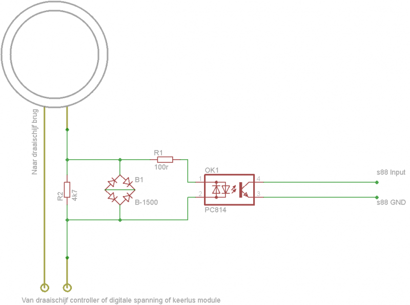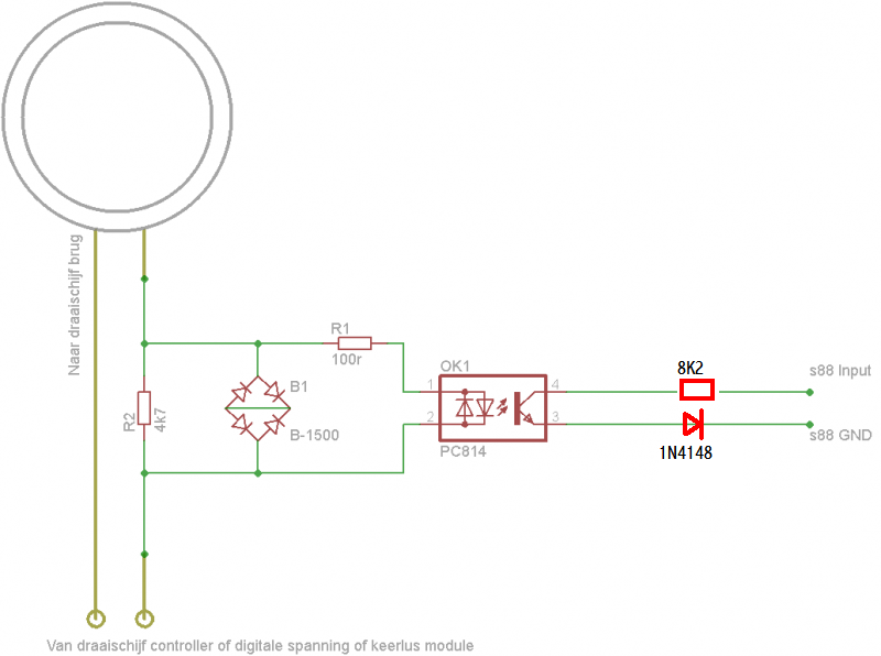 Bedankt voor het reageren, als ik het goed begrepen heb dan gaat de 8K2 nr 4 van de octocoupler naar de plus aansluiting i.p.v. de S88 input, en de  diode naar de S88SD van nr 3 van de octocoupler.