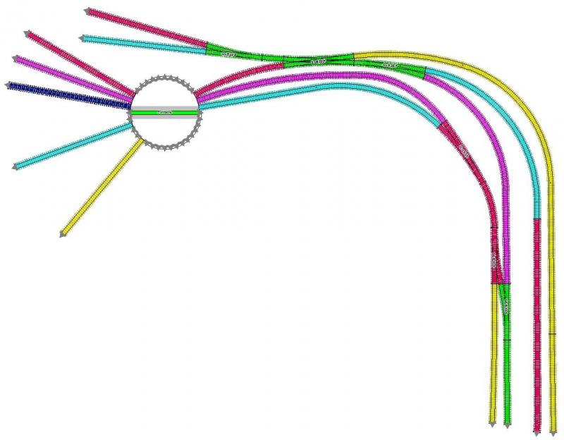 Wat betreft je vraag, ik zou voor het laatste gaan. Isolaties en de cab-ciontrol schakelaar weg. Ik zit alleen met een vraagpunt. Missschien heb ik je verhaal daarover niet goed begrepen, maar als je draaischijf in de stand ligt, waarbij hij een verbinding vormt van paars naar rood (een stap met de klok mee) kun je dan met de schakelaars van het roco draaischijf kastje kiezen voor paars of rood? Als dit zo is, dan cab controlschakelaar en isolaties weg. Het roco draaischijfkastje is dan je "cabcontrol", waarbij niet gekozen wordt voor trafo 1 of trafo 2, maar voor spoor link of rechts.