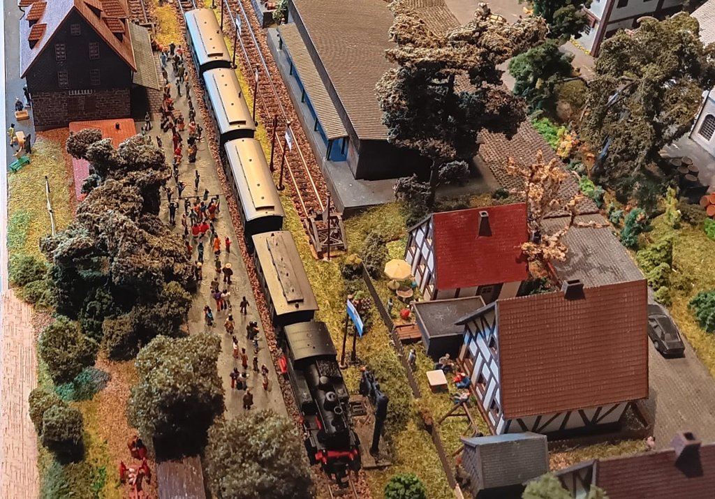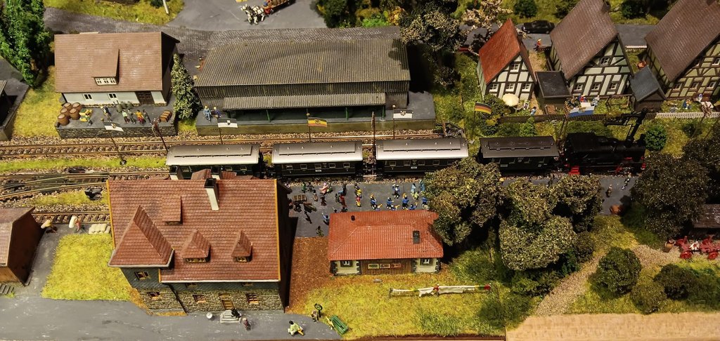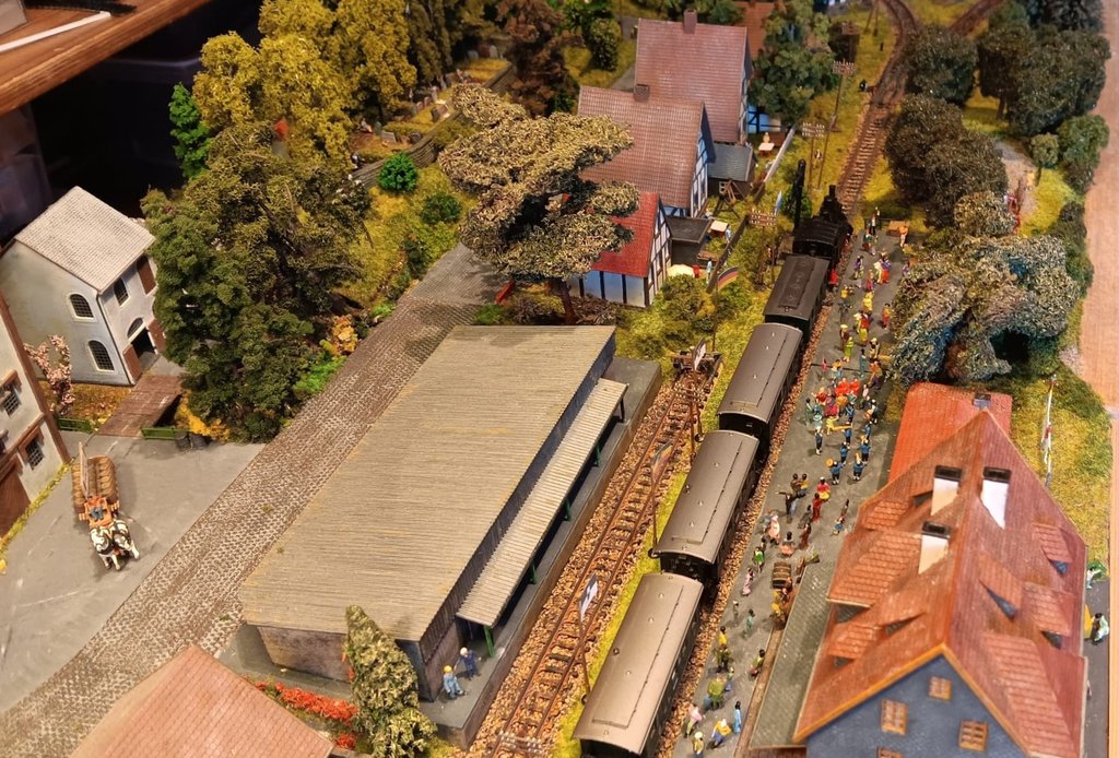 De koppeling. Op het station komen nog meer mensen en een fanfare voor de opening van de spoorverlenging.