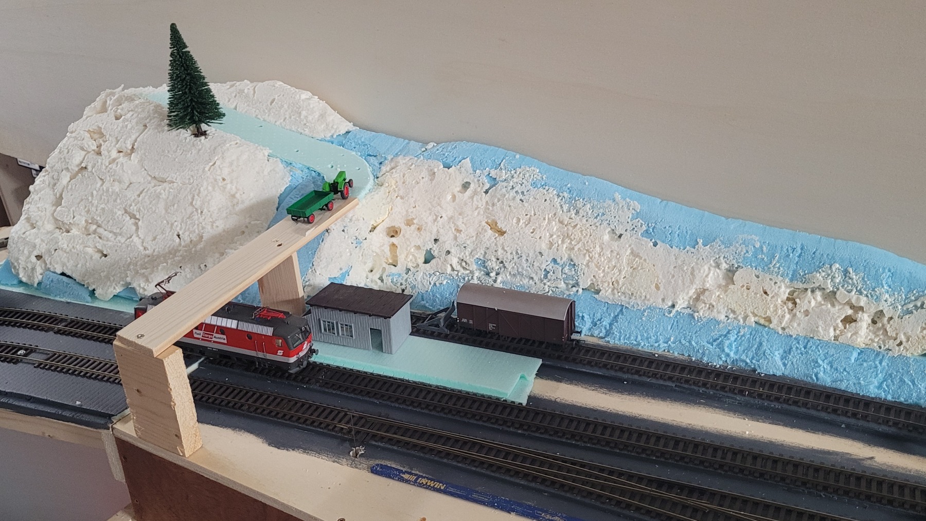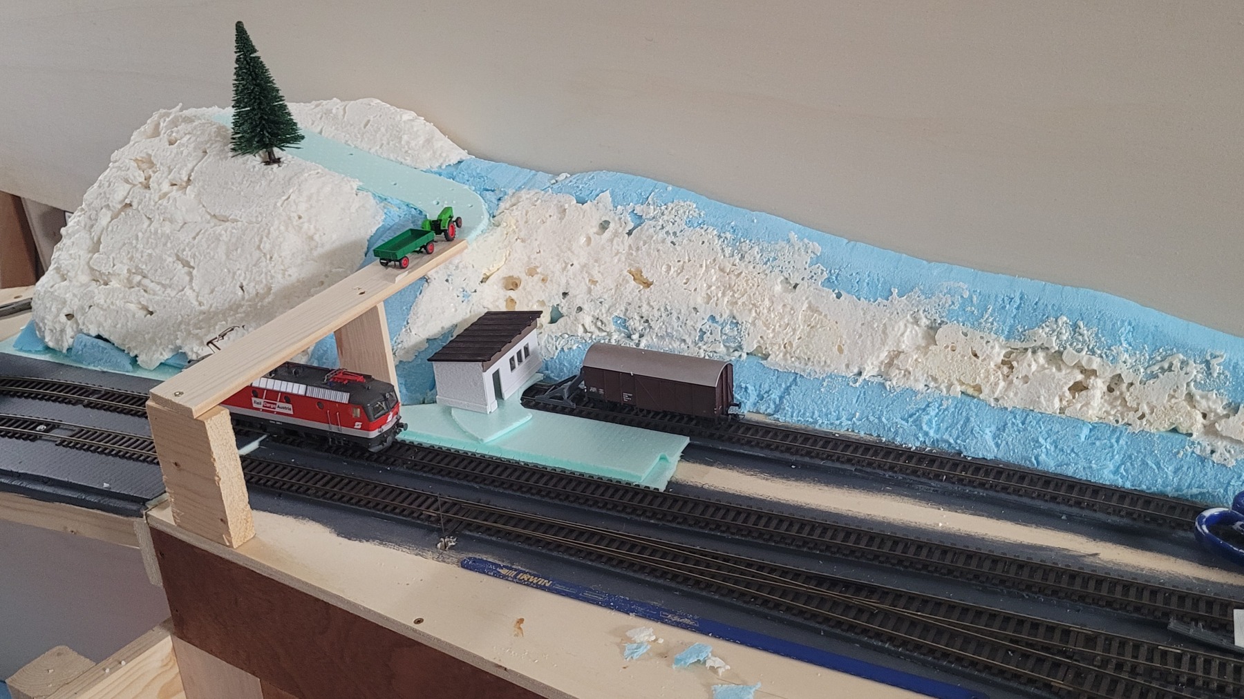 Overigens ook nog een boogbrug (zoals ook in Dalaas) overwogen, maar dat werd zeg maar asymmetrisch; toch gek hoe feng-shui werkt... Afijn; betonnen brug dus. En daar gaat dan ook weer veel meer denkwerk in zitten... Afijn; op goed geluk werkt toch niet zo goed, dus eerst maar schetsje gemaakt en tijdelijke variant geplaatst, ook om het landschap vorm te geven. Dat werd nog veel meer schaven aan de berg, contour van de weg alvast maken, etc. Maar nou de vraag; blijft het een Bahnmeisterei..? Spoortje korter maken lijkt erg geforceerd. Ik heb ook nog de Vollmer bouwkeet geprobeerd, maar het blijft allemaal erg lomp... Eventueel kan je loods aan de voorzijde plaatsen, met een simpel overpad naar het losspoortje. Maar dan kan je een wagon net zo goed aan de voorzijde parkeren. Dus wellicht toch een Schutzgleis... toch less-is-more!