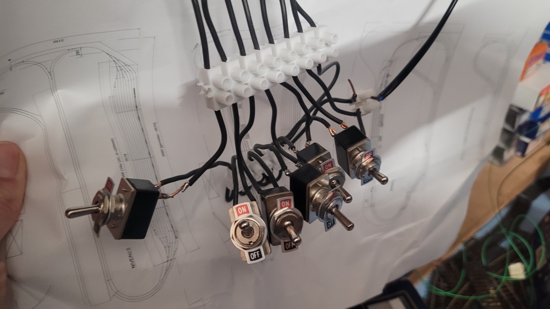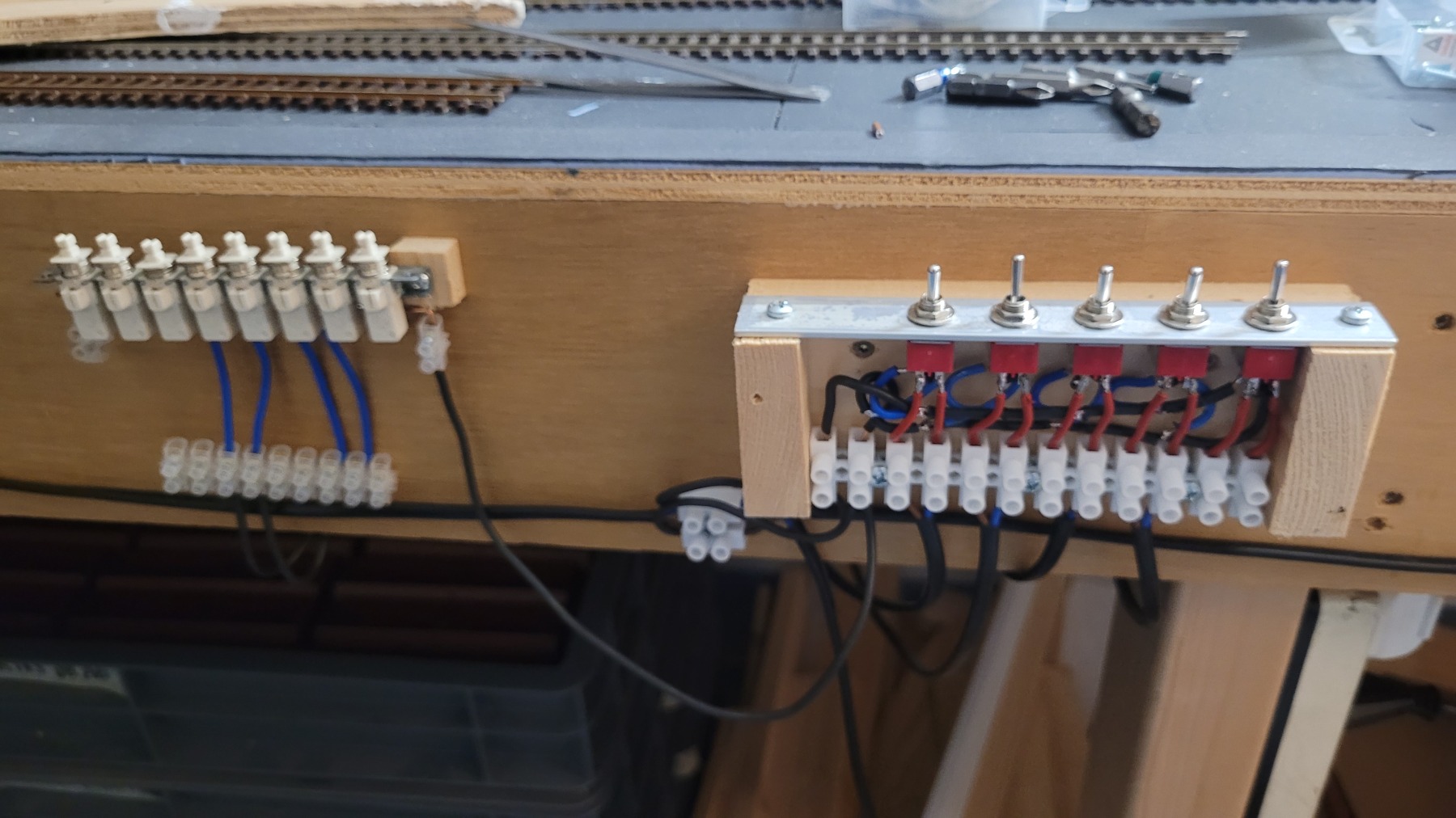Op de eerste foto mijn al jaren 'voorlopige' schakelaars van de stationssporen. Op de tweede foto de 5 schakelaars (tweepolig met middenstand) die stroom geven, of isoleren of polariteit omdraaien, aan de sporen van het emplacementje boven aan het hellingtraject. De stand van de schakelaars naar voor of achter correspondeert met een trein 'naar boven' of 'naar beneden', wat een aardig geheugensteuntje is.