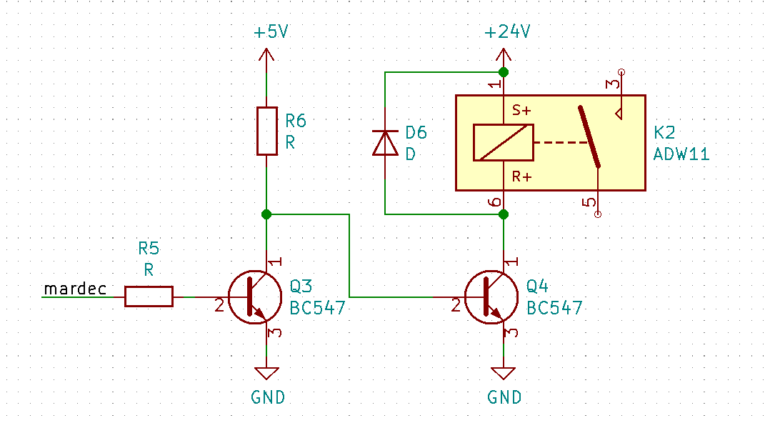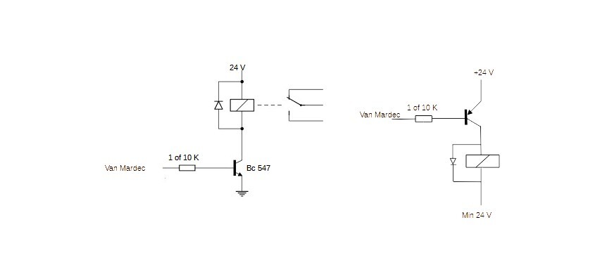 Het relais aan de rechterzijde met de PNP transistor kan echter niet werken. Die houdt inderdaad de spoel bekrachtigd totdat de basis pin naar 24V wordt getrokken en de mardec pin komt niet boven de 5V uit.