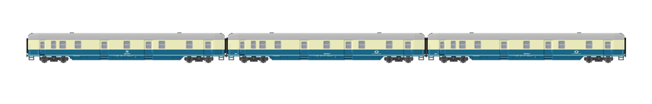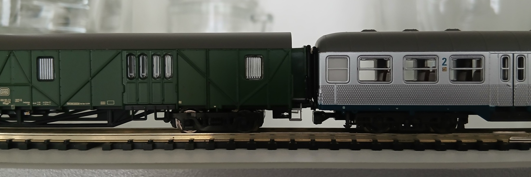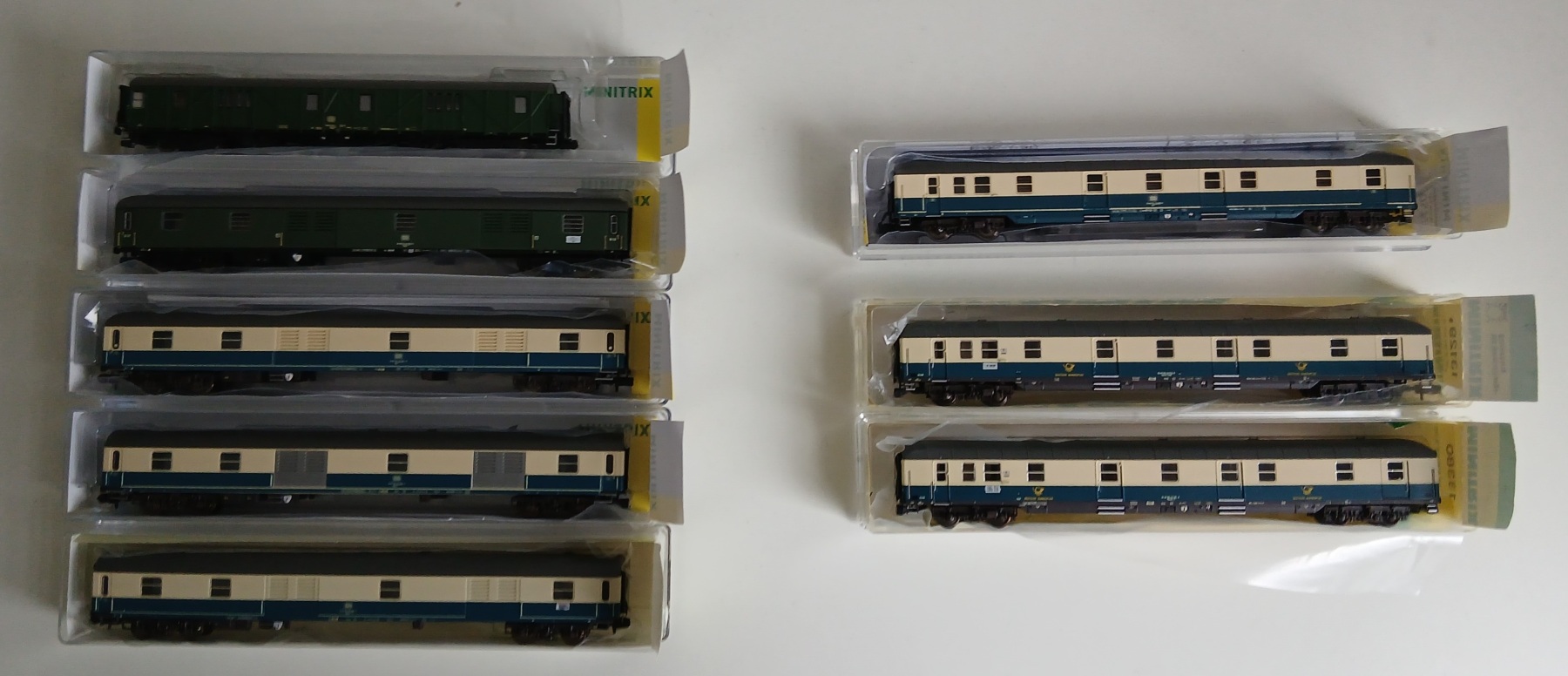 Alle rijtuigen zijn van Minitrix, de laatste twee komen uit een set van twee (18201) en zijn de enige Deutsche Bundespost wagens, de rest is van de DB.