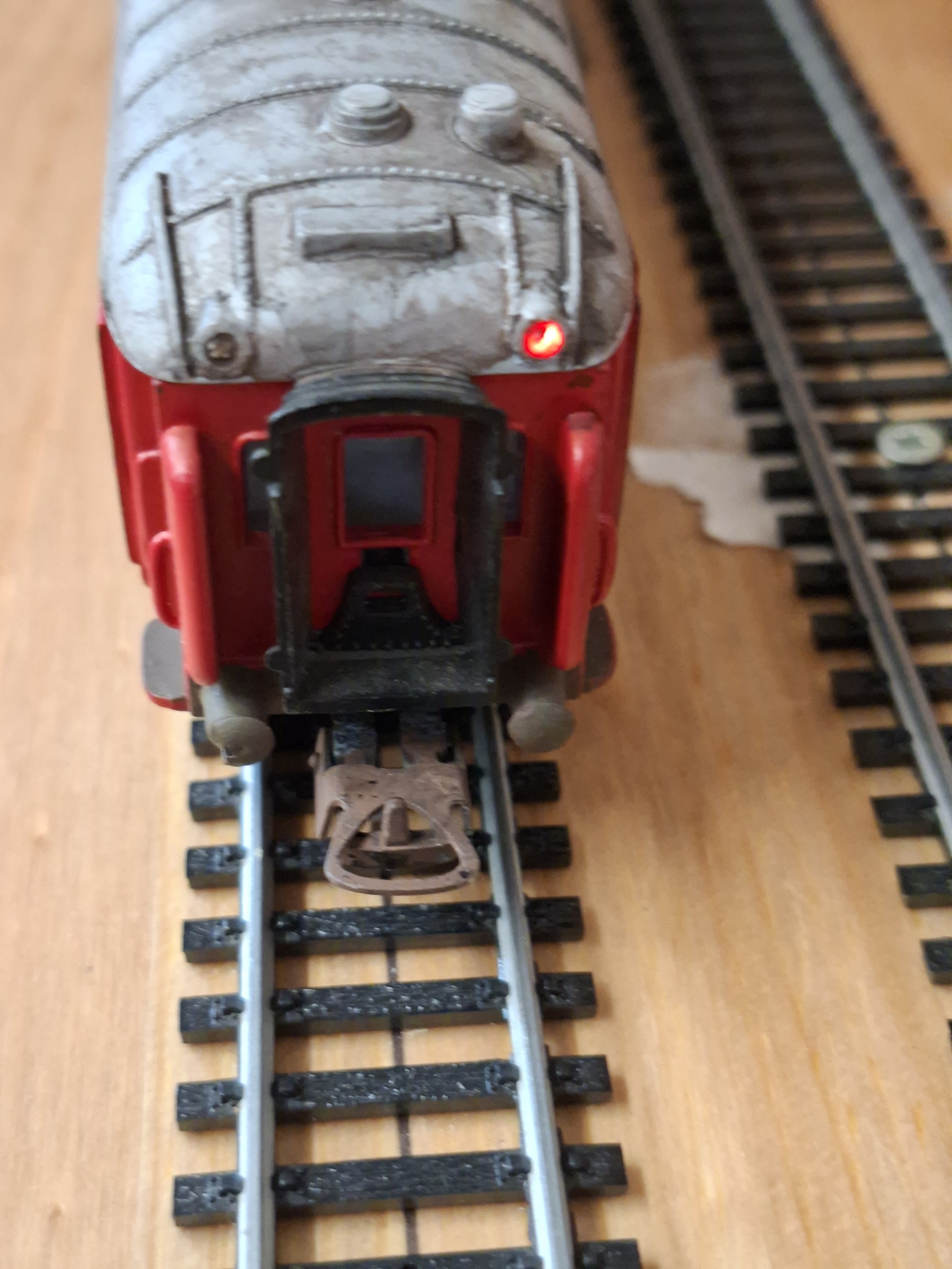 Maar met het lood wat er nu in zit gaat het met 4 wagonnetjes prima, meer heb ik niet geprobeerd. Hij laat zich redelijk sturen. Wellicht als je nog een half uur met allerlei decoder instellingen speelt dat het beter kan, maar ik vind het goed genoeg zo. Is ook maar rangeren he, de Orientexpress hoeft er niet achter......