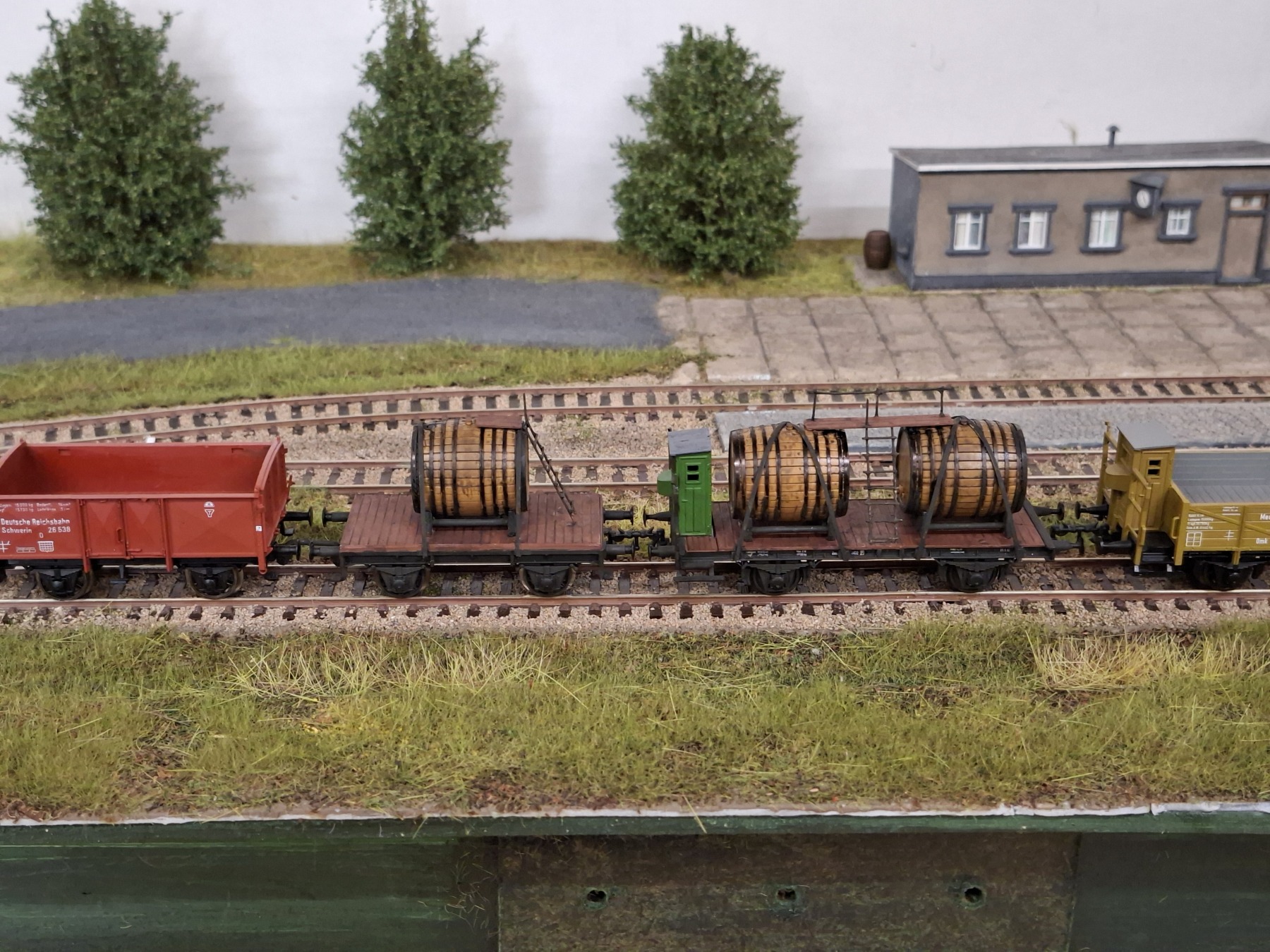 in het écht werden ook soms ex- 'platte wagens' gebruikt voor de wijntonnen, zoals modeltreinfabrikanten ...