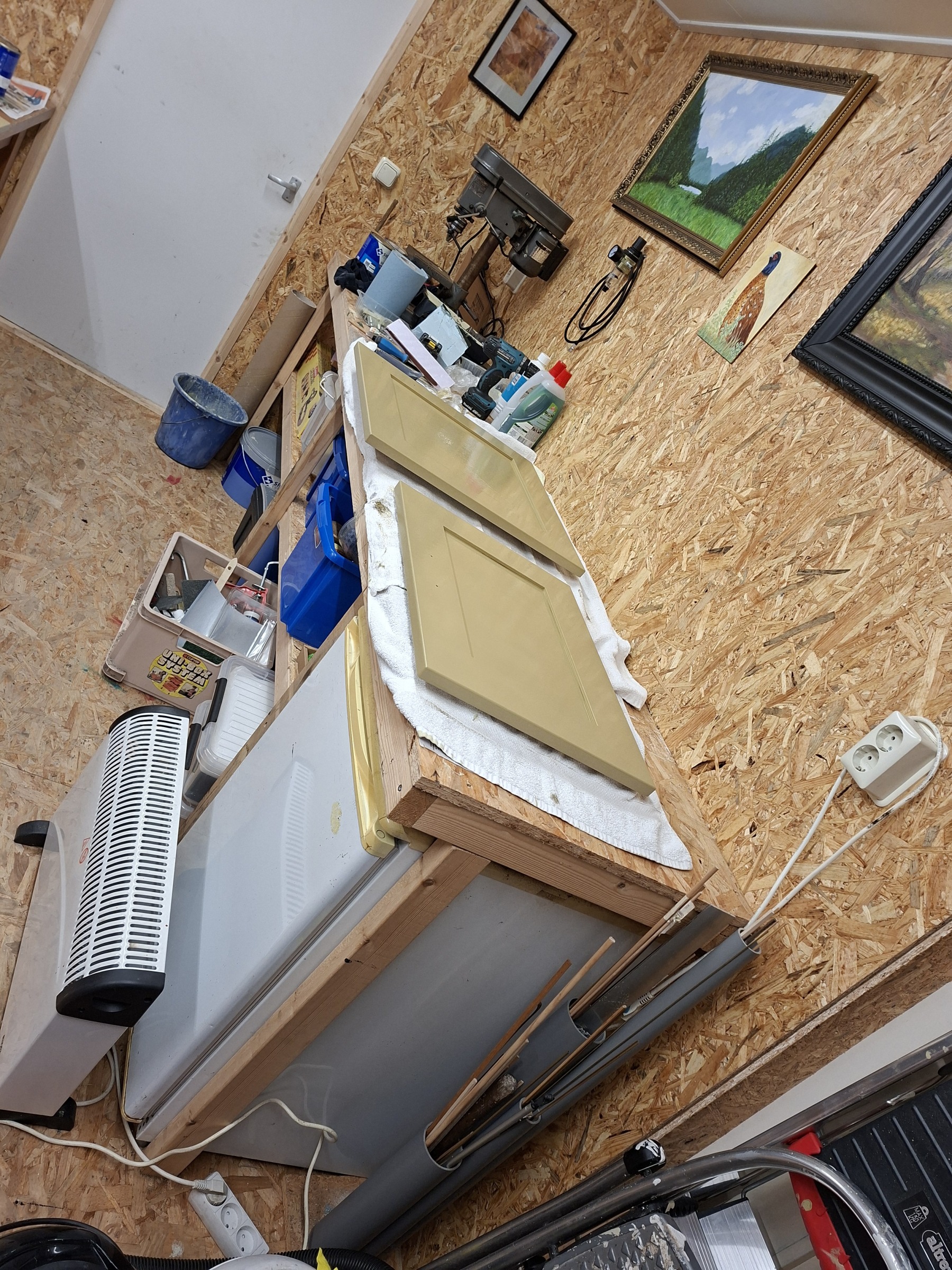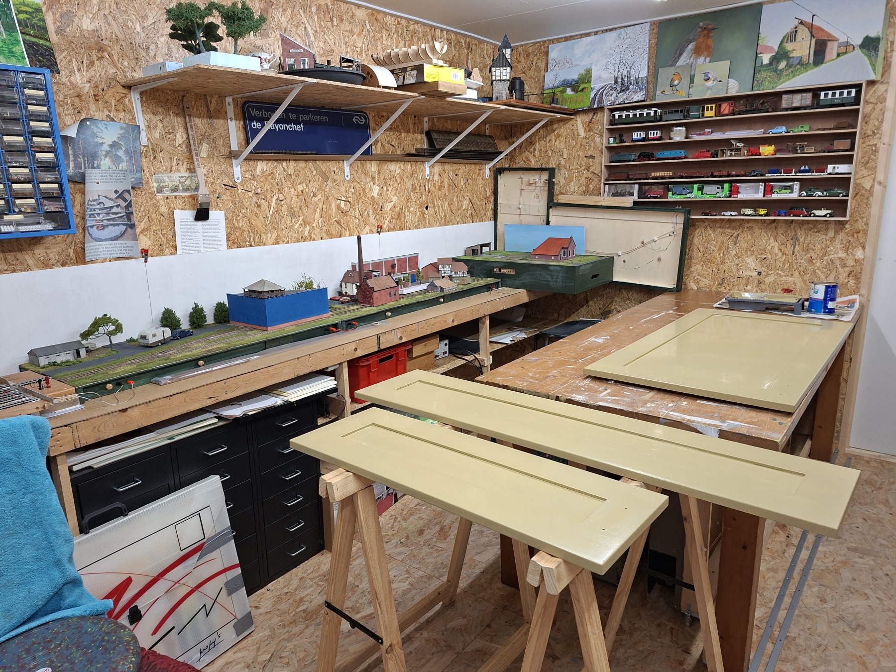 Mijn 'atelier' is tijdelijk werkplaats voor schilderwerkzaamheden. Nu even niet voor schilderijen maar voor keukenkastdeurtjes. Even de keuken renoveren, dan kan ik weer met de treintjes spelen.